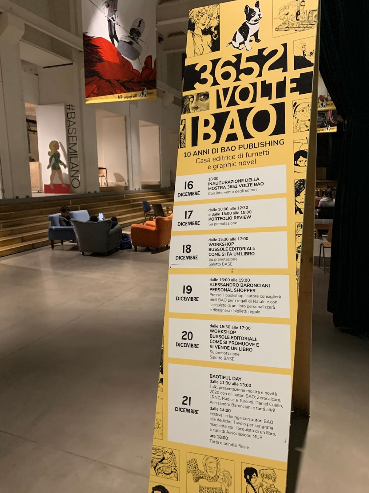 Dal 16 al 21 dicembre, in collaborazione con BASE Milano che ci ospiterà nella sua sede di Via Bergognone 34, vi racconteremo i primi dieci anni (ovvero 3652 giorni) della vita di BAO Publishing, con una serie di iniziative che culmineranno il 21 dicembre con il Baotiful Day, un mini-festival in cui al mattino vi sveleremo le uscite italiane (ci saranno annunci CLAMOROSI) del 2020 e al pomeriggio potrete venire a incontrare i vostri autori preferiti e a farvi dedicare i loro libri!Sia la mostra che il festival saranno a ingresso libero e gratuito. La mostra sarà accessibile ogni giorno secondo gli orari di apertura di BASE Milano. Per tutta la durata della mostra ci sarà un bookshop dove potrete acquistare i libri fondamentali della storia BAO e alcune chicche imperdibili!