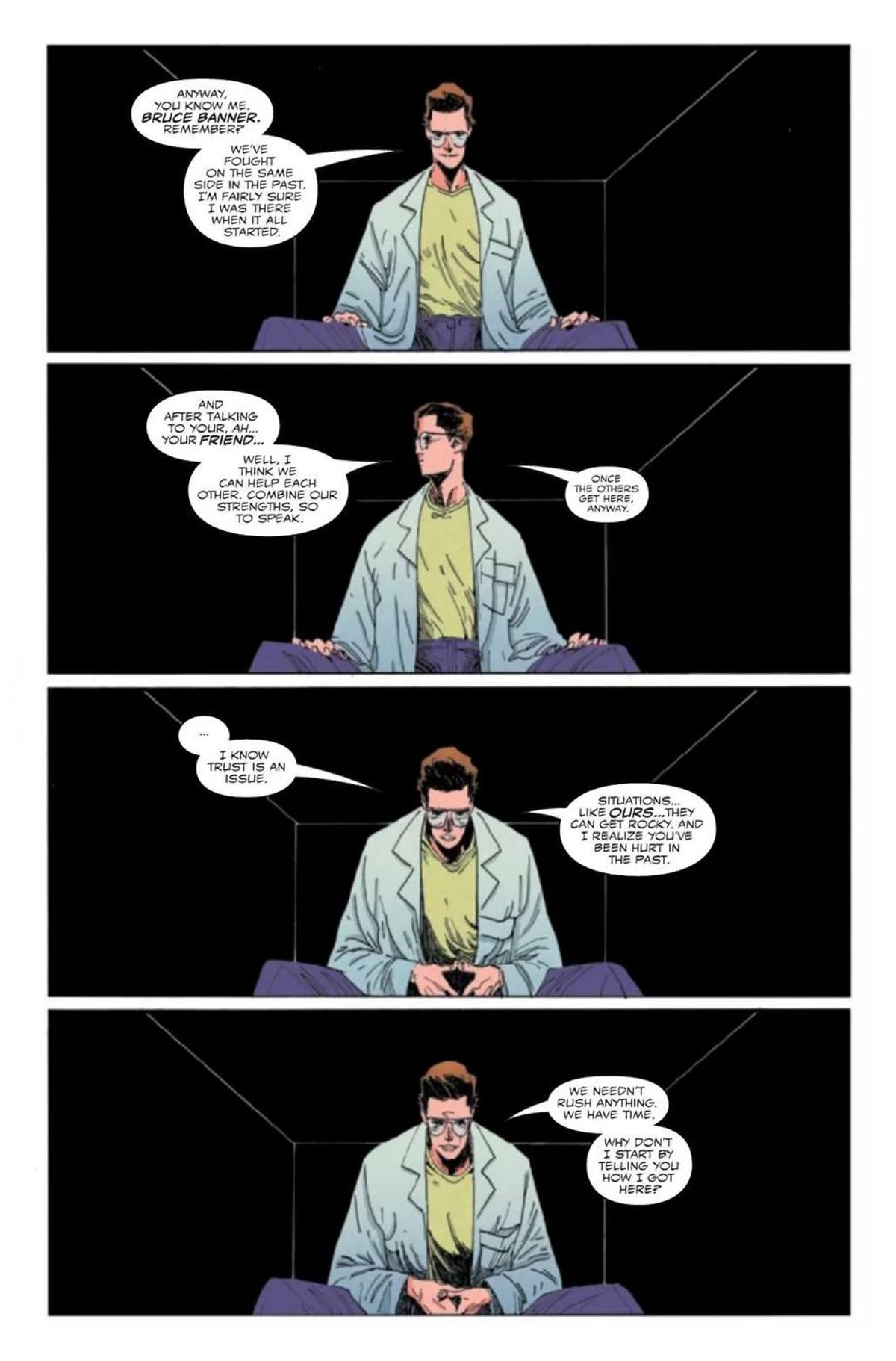 Quando Donny mi ha detto che aveva in mente di far assorbire Hulk da un simbionte, ho pensato che avrei potuto tranquillamente far funzionare la cosa nella storia che stavo raccontando. Sarebbe stato ancora più facile se fosse arrivata uno o due mesi dopo. Il problema più grosso era giustificare la presenza di Hulk in New Jersey, dato che in quel momento era in zona Sud Ovest degli Stati Uniti. Nei prossimi mesi sarebbe stato meno complesso, ma non voglio anticipare troppo.