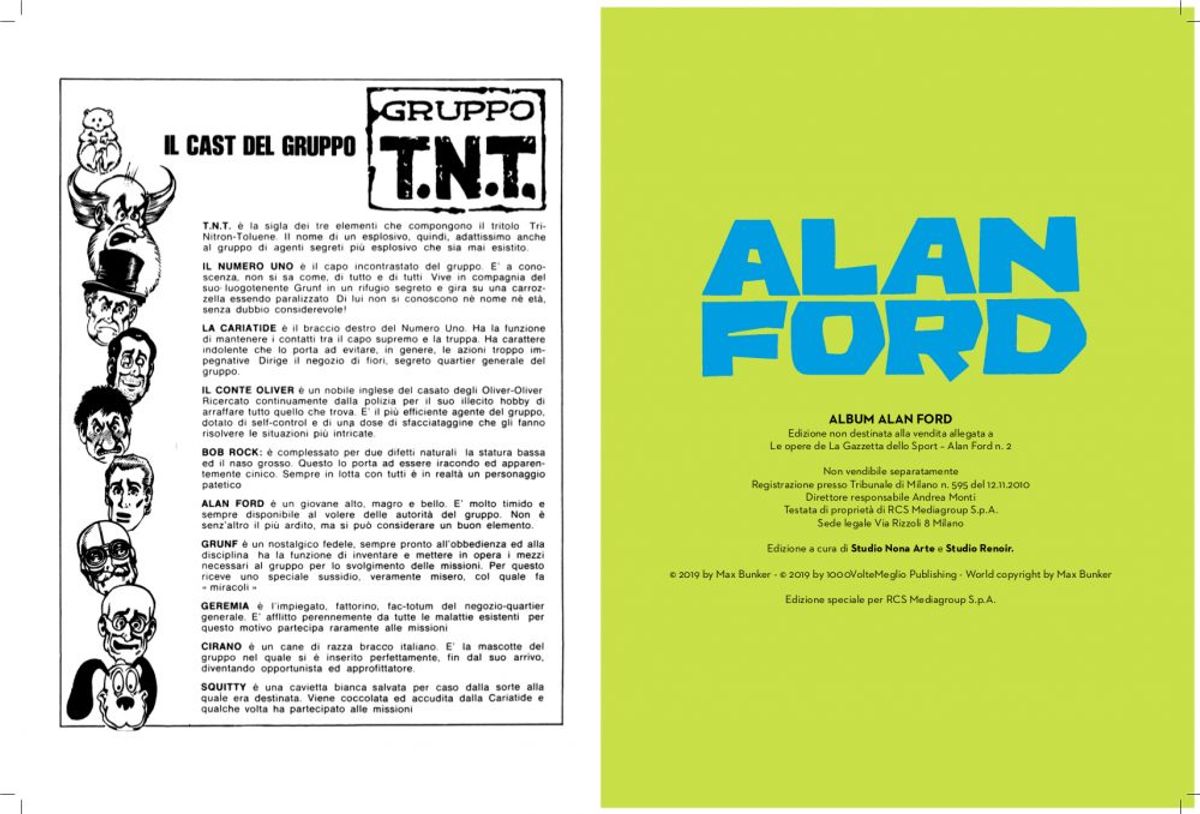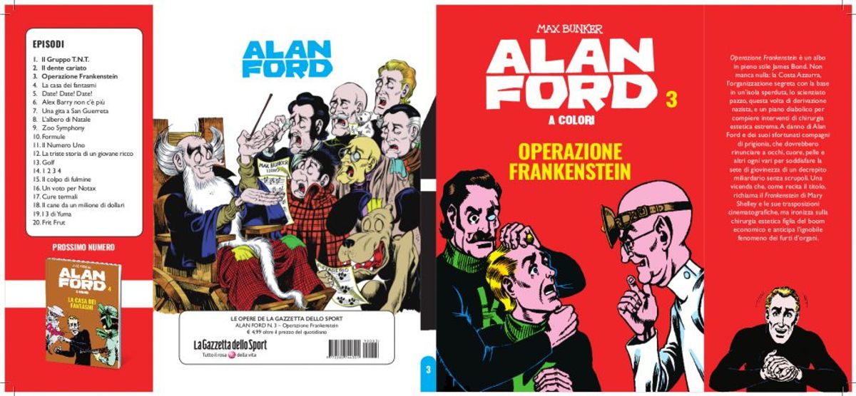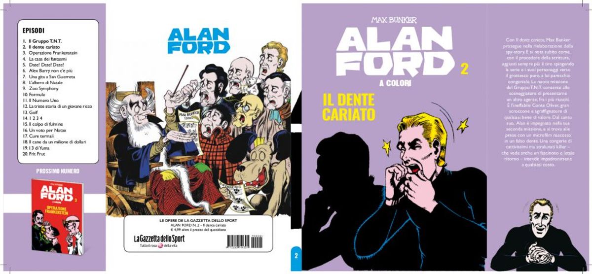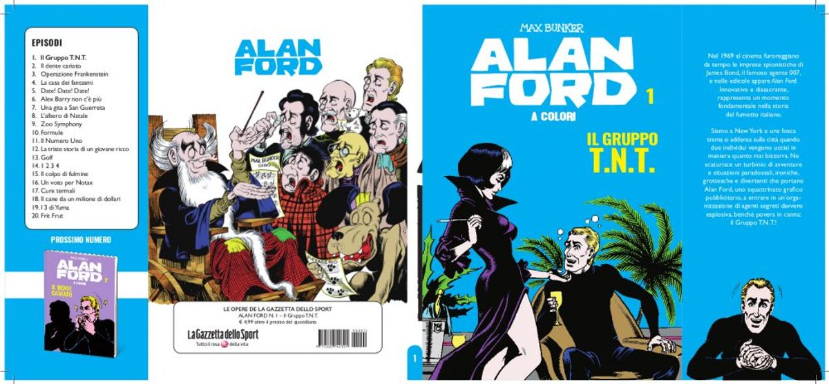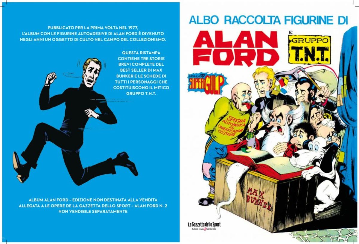 Ogni albo (14,2 x 20 cm, B, 128 pp., col.) sarà venduto al prezzo di 4,99 Euro (più il costo del quotidiano sportivo). Con il secondo i lettori troveranno in regalo un album da collezione, da completare con figurine gratuite da raccogliere con ogni uscita.Vi lasciamo alla sinossi di Alan Ford, il piano completo dell’opera, le copertine dei primi tre brossurati e un'anteprima dell'album.