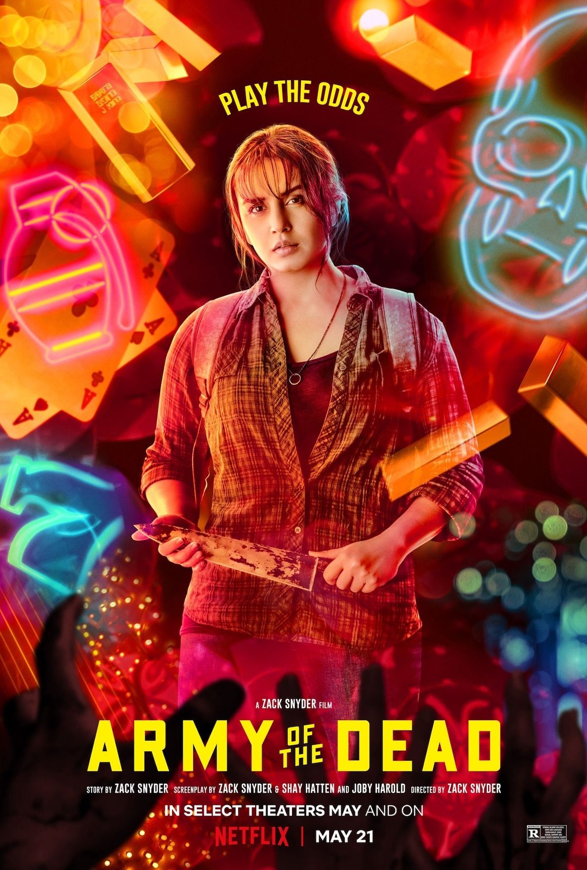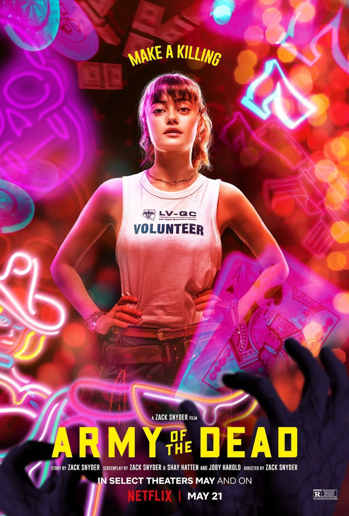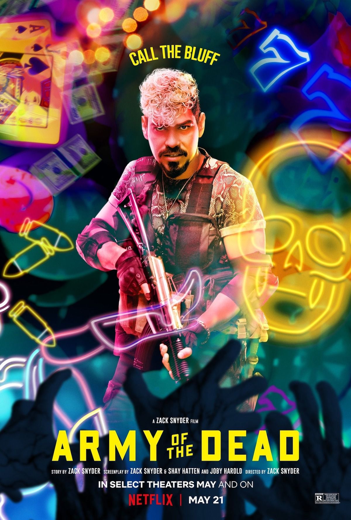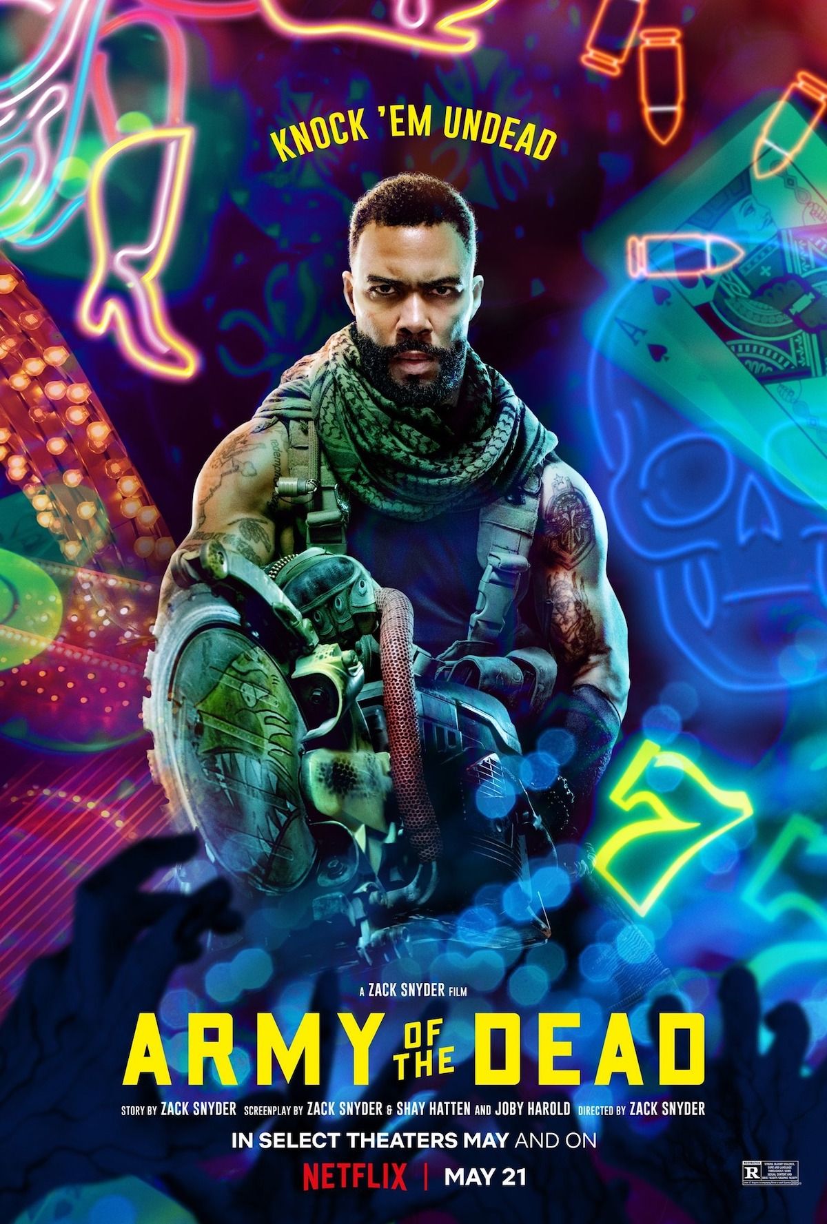 ARMY OF THE DEAD è diretto da Zack Snyder (qui anche direttore della fotografia) con una sceneggiatura di Snyder & Shay Hatten e Joby Harold, tratta da una storia di Snyder. Il film è prodotto da Deborah Snyder, p.g.a .; Wesley Coller, p.g.a .; Zack Snyder, p.g.a. Il film è interpretato anche da Richard Cetrone e Michael Cassidy.Dal regista Zack Snyder (300, Zack Snyder’s Justice League), ARMY OF THE DEAD è ambientato a Las Vegas dopo un’invasione di zombie che l’ha lasciata in rovina e isolata dal resto del mondo. Quando Scott Ward (Dave Bautista), ex eroe della guerra contro gli zombie che ora cucina hamburger alla periferia della città, viene avvicinato dal boss di un casinò Bly Tanaka (Hiroyuki Sanada), riceve una proposta incredibile: entrare nella zona di quarantena infestata dagli zombie per recuperare 200 milioni di dollari sepolti nel caveau del casinò prima che la città venga bombardata dal governo entro 32 ore. Spinto dalla speranza che la ricompensa possa aiutare a spianare la strada ad una riconciliazione con la figlia Kate (Ella Purnell), Ward accetta la sfida, mettendo insieme una squadra sconclusionata. Maria Cruz (Ana de la Reguera), un asso della meccanica e vecchia amica di Ward; Vanderohe (Omari Hardwick), una macchina ammazzazombie; Marianne Peters (Tig Notaro), cinico pilota di elicotteri; Mikey Guzman (Raúl Castillo), un influencer stravagante e Chambers (Samantha Win), il suo ride-or-die; Martin (Garret Dillahunt), capo della sicurezza del casinò; un audace guerriero conosciuto come il Coyote (Nora Arnezeder) che recluta Burt Cummings (Theo Rossi), una viscida guardia di sicurezza; e un abile scassinatore tedesco di nome Dieter (Matthias Schweighöfer). Scott trova un inaspettato ostacolo emotivo quando Kate si unisce alla spedizione per cercare Geeta (Huma Qureshi), una madre scomparsa in città. Con il ticchettio del tempo che scorre, un caveau notoriamente impenetrabile e un’orda di zombie Alpha più intelligenti e veloci che si avvicina, solo una cosa è certa nella più grande rapina mai tentata: i sopravvissuti si prendono tutto.