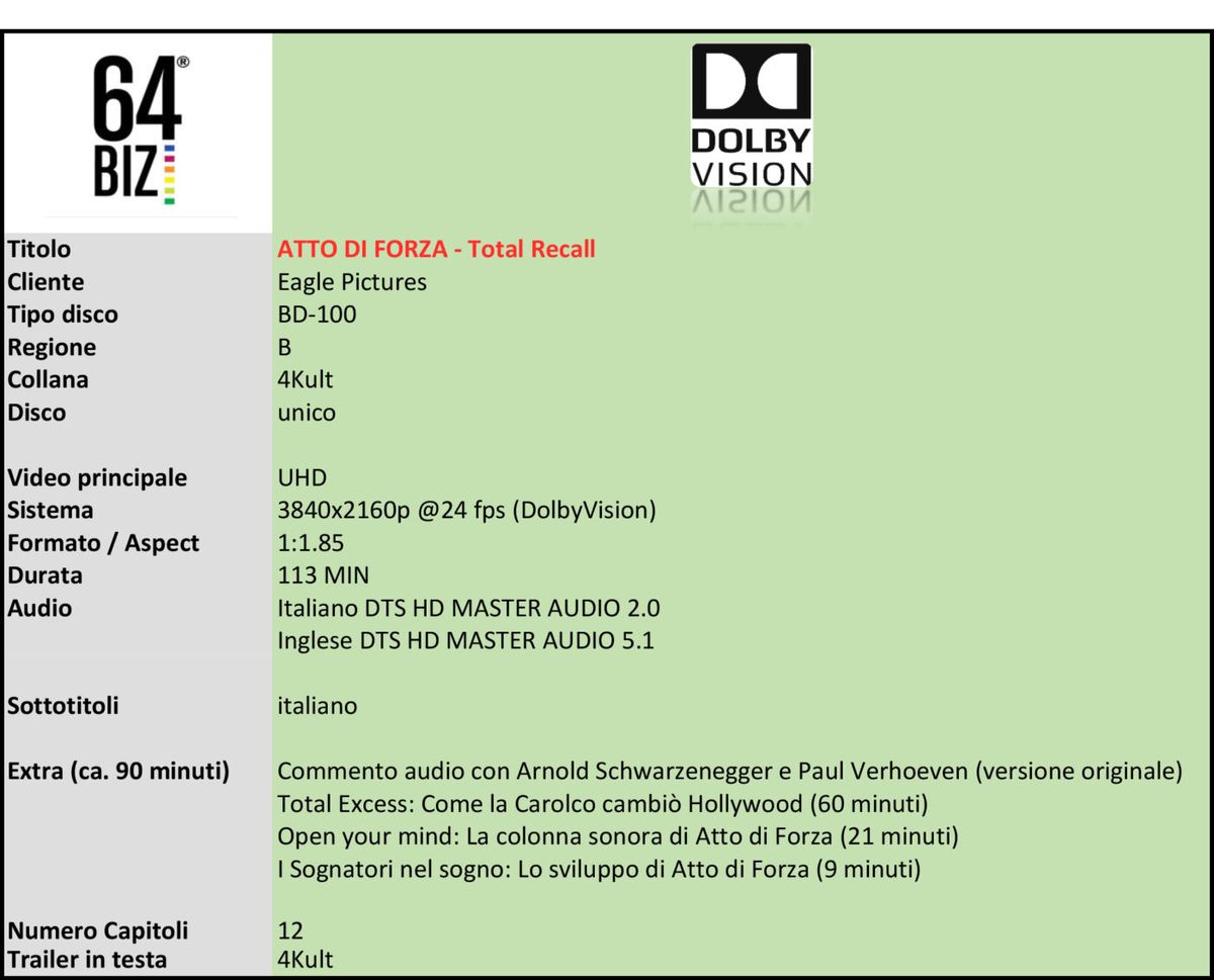 Il film sarà disponibile in un'inedita versione 4K, contenente il doppio disco 4k e Blu-ray e una card da collezione numerata. Presenti sul disco 4K anche contenuti extra inediti per oltre 90 minuti.Vincitore del premio Oscar per i Migliori Effetti Speciali, "Atto di Forza" è ancora oggi una imperdibile avventura fantascientifica. Siamo nel 2084 e per l’operaio Doug Quaid (Arnold Schwarzenegger) l’ossessione è una sola: andare su Marte. Oltre ai normali viaggi di linea esistono anche società come la Recall capaci di impiantare nella memoria dei loro clienti il ricordo di settimane di vacanza passate sul pianeta rosso. Doug si rivolge alla Recall e lì cominciano i guai perché i tecnici scoprono che qualcosa non va nella sua testa…