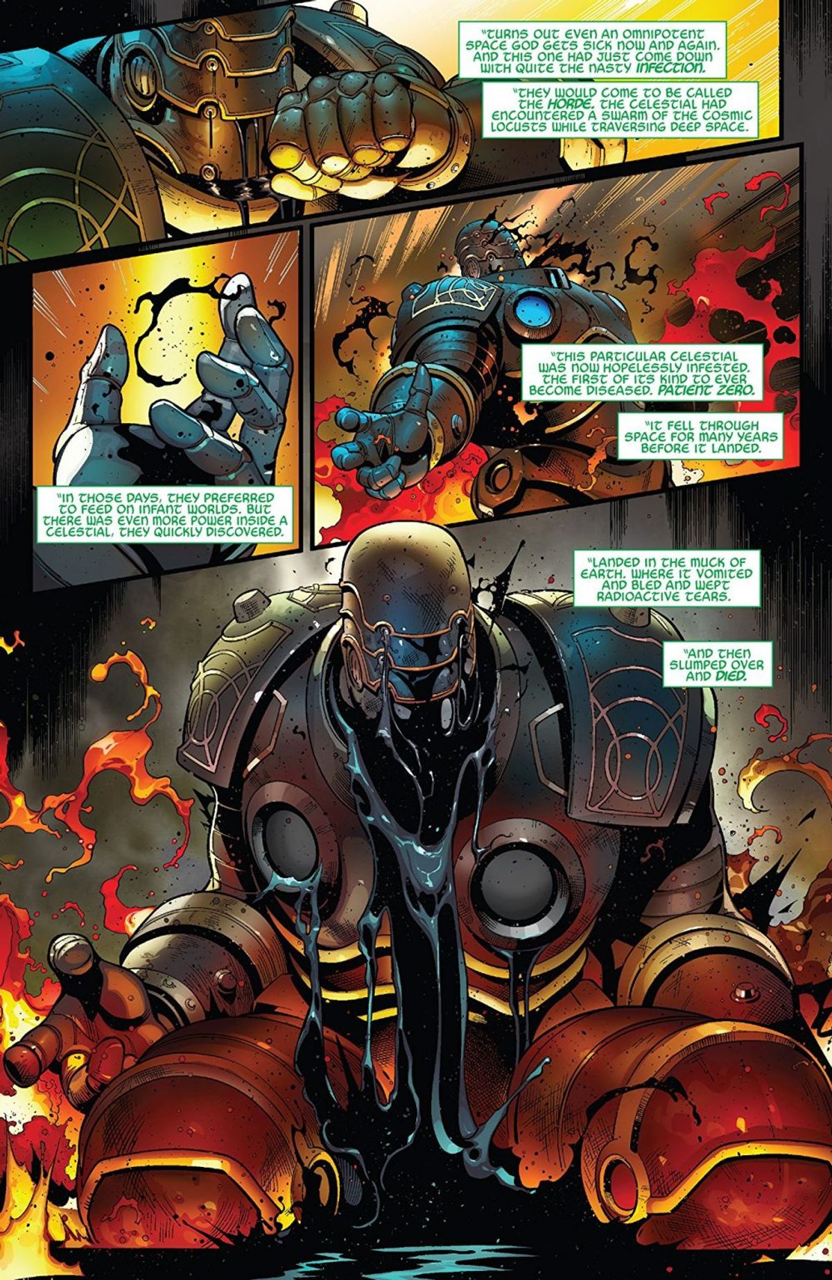 Sulle pagine di Avengers #6, realizzato dal medesimo team creativo e attualmente in vendita nelle fumetterie statunitensi, questa teoria viene discussa dagli stessi Vendicatori, i quali giungono a una conclusione interessante: potrebbe effettivamente esistere una connessione tra i super umani e gli alieni che uccisero il Progenitore, ma probabilmente i poteri generati da questa mescolanza genetica rappresentano ora gli anticorpi sviluppati dalla Terra stessa per combattere quei parassiti, con i Celestiali che non avrebbero eliminato il pianeta al fine di interferire nell'evoluzione umana e permettere ai terrestri, un giorno, di sconfiggere l'Orda.