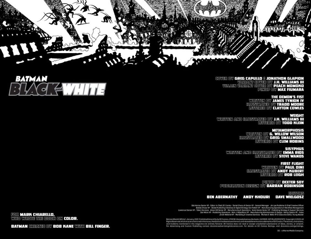 Esce oggi il primo numero del ritorno dell'antologico Batman: Black & White. Un nuovo gruppo di autori DC Comics di primissimo piano è pronto a dare vita a nuove avventure dedicate all'universo narrativo dell'Uomo Pipistrello che, in questa incarnazione della testata, saranno presentate in una miniserie in sei parti.In questo primo numero troviamo storie firmate dai seguenti team creativi: James Tynion IV e Tradd Moore, con un racconto incentrato su Ra’s al Ghul e la Lega degli Assassini; J.H. Williams III torna alla DC Comics con un viaggio attraverso il passato di Batman; Emma Rios si cimenta in una storia sull'eterna lotta del Crociato Incappucciato; Paul Dini e Andy Kubert ci mostrano l'invasione della Batcaverna a opera di un gruppo di Man-Bat ninja, mentre G. Willow Wilson e Greg Smallwood ritraggono Batman nel più strano incontro con Killer Croc.Ma l'elenco degli autori coinvolti comprende anche nomi eccellenti quali Tom King e Mitch Gerads, autori di Mister Miracle e Strange Adventures; Gabriel Hardman e Corinna Bechko (Green Lantern: Earth One); Sophie Campbell (Jem and the Holograms, Teenage Mutant Ninja Turtles, Wet Moon) di ritorno alla DC Comics dopo oltre dieci anni. Assisteremo anche all'esordio di Dustin Weaver (Avengers) e David Aja (Hawkeye) e ritroveremo Lee Weeks, Chip Zdarsky, Nick Bradshaw, Tim Seeley, Kelley Jones, John Arcudi, James Harren, Bilquis Evely, Joshua Williamson e Riley Rossmo.