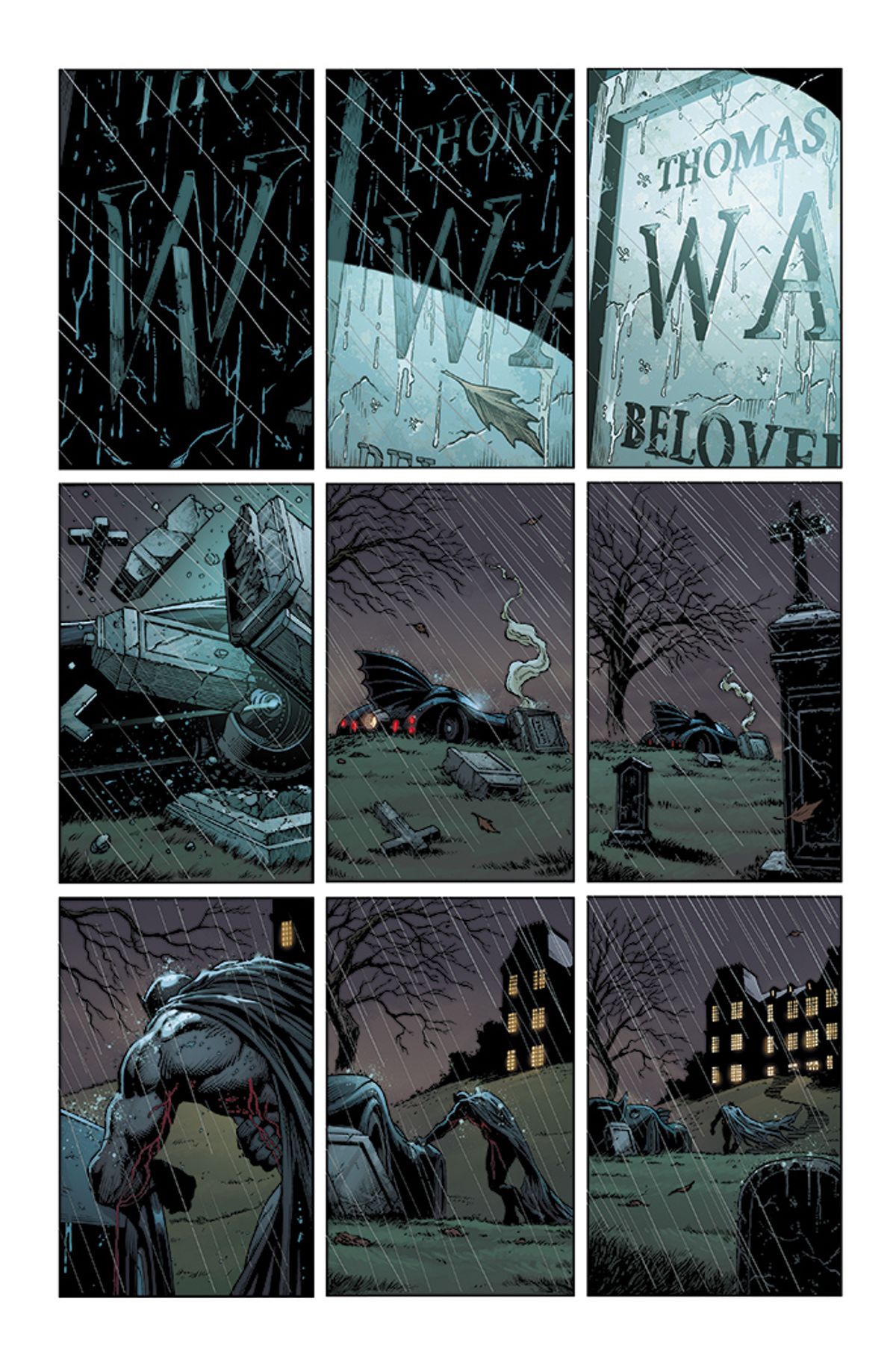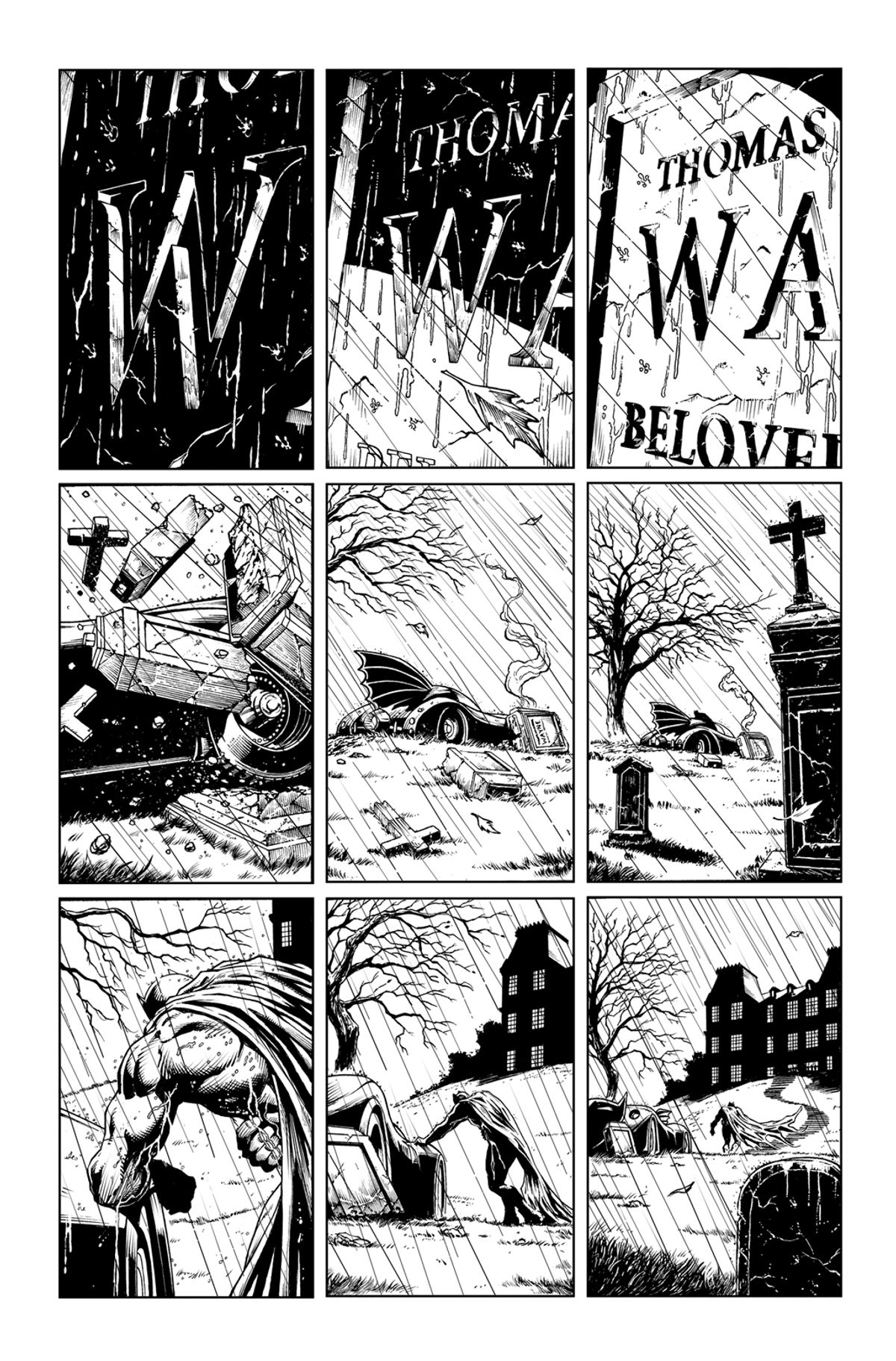 Inoltre, le prime tre vignette sono da intendersi come un omaggio all’apertura di The Killing Joke, dove indietreggiamo da un primo piano stretto… Noterete poi che la foglia che cade è la stessa di The Killing Joke, pagina 1 vignetta 2… È questo l'approccio che troverete in tutto il fumetto.