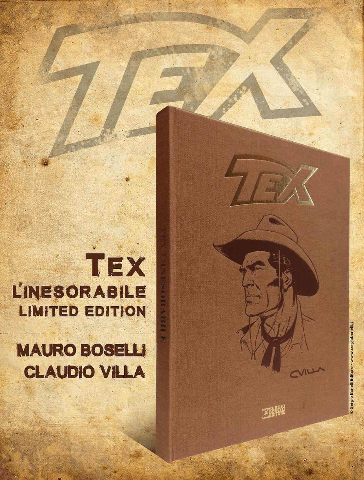 Tex l'inesorabile in formato cartonato per le fumetterie e le libreria (27,5 x 37 cm, 240 pp., b/n), sceneggiato dalla prima penna ed editor del personaggio Mauro Boselli, uscirà il prossimo 21 novembre al prezzo di 34,90 Euro. La classica edizione brossurata da edicola arriverà invece a febbraio 2020.La suddetta versione limited, di solo 699 copie, impreziosita da una copertina telata su cui sono impressi a caldo il logo di Tex e un primo piano dell'icona Bonelli (opera dello stesso Villa), contiene una stampa esclusiva a mezze tinte su carta di pregio firmata personalmente dal disegnatore comasco. Il prezzo di vendita di questo pezzo da collezione è di 64,90 Euro. Parliamo dunque, nel suo complesso, di tre diverse edizioni per un'avventura attesa da quasi un ventennio.
