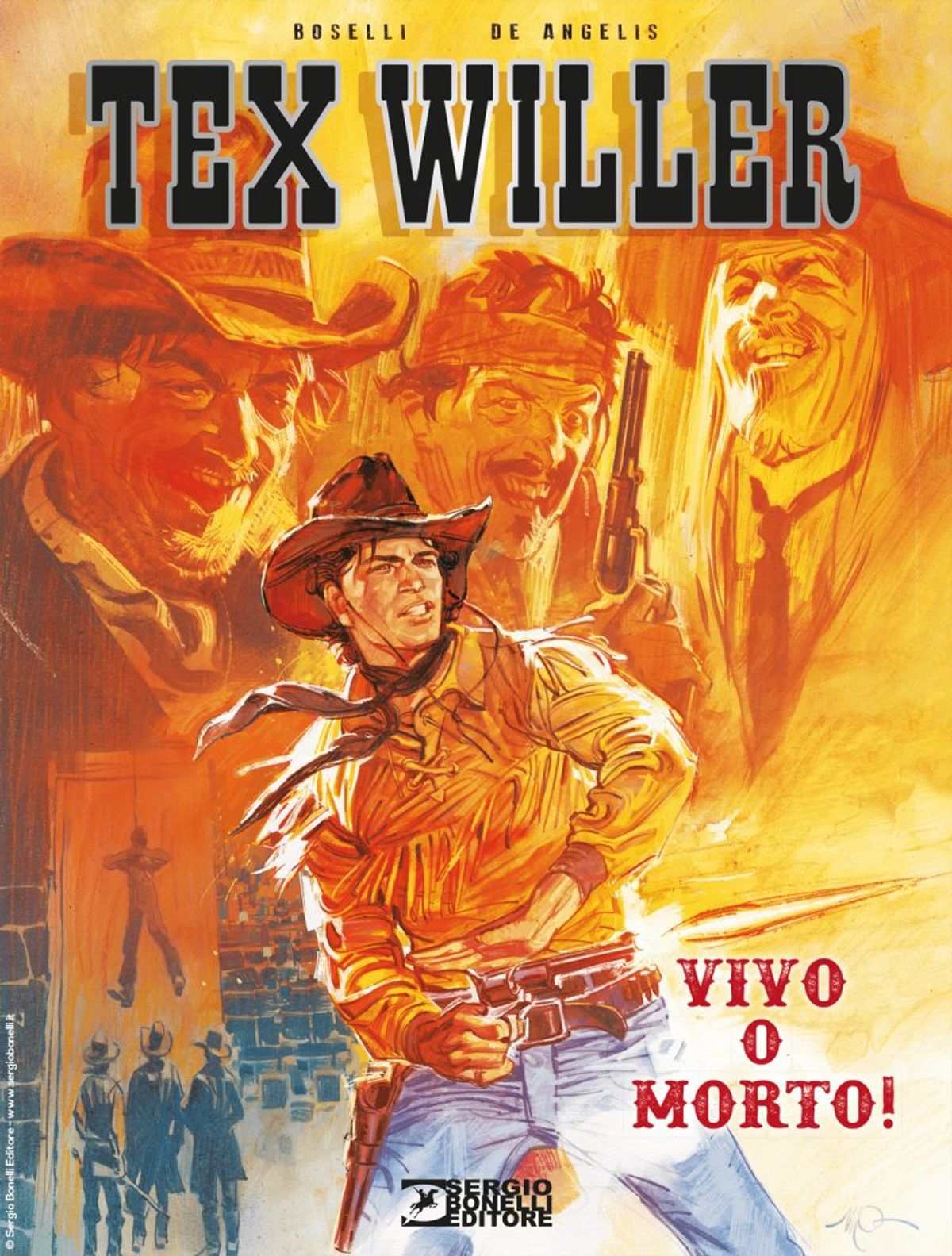 Il primo albo sarà caratterizzato da una copertina composta da due immagini sovrapposte (sovraccoperta in acetato e copertina in cartoncino) realizzata de Giancarlo Olivares (6,00 Euro); il secondo ne avrà invece una in versione dorata e con alette che riproduce l'illustrazione originale di D'Antonio e un'altra inedita firmata da Michele Benevento (7,00 Euro).Merita certamente una menzione - anche se non si tratta di una variant - la splendida copertina inedita di Massimo Carnevale per il cartonato (19,5 x 26 cm, 256 pp., 26, Euro) Tex Willer: Vivo o morto! (in fumetteria e in libreria dal 21 marzo), che ripropone in quadricromia il ciclo di quattro episodi, firmato da Mauro Boselli e Roberto De Angelis, che hanno dato il via alla nuova collana dedicata alla versione giovanile dell'eroe.