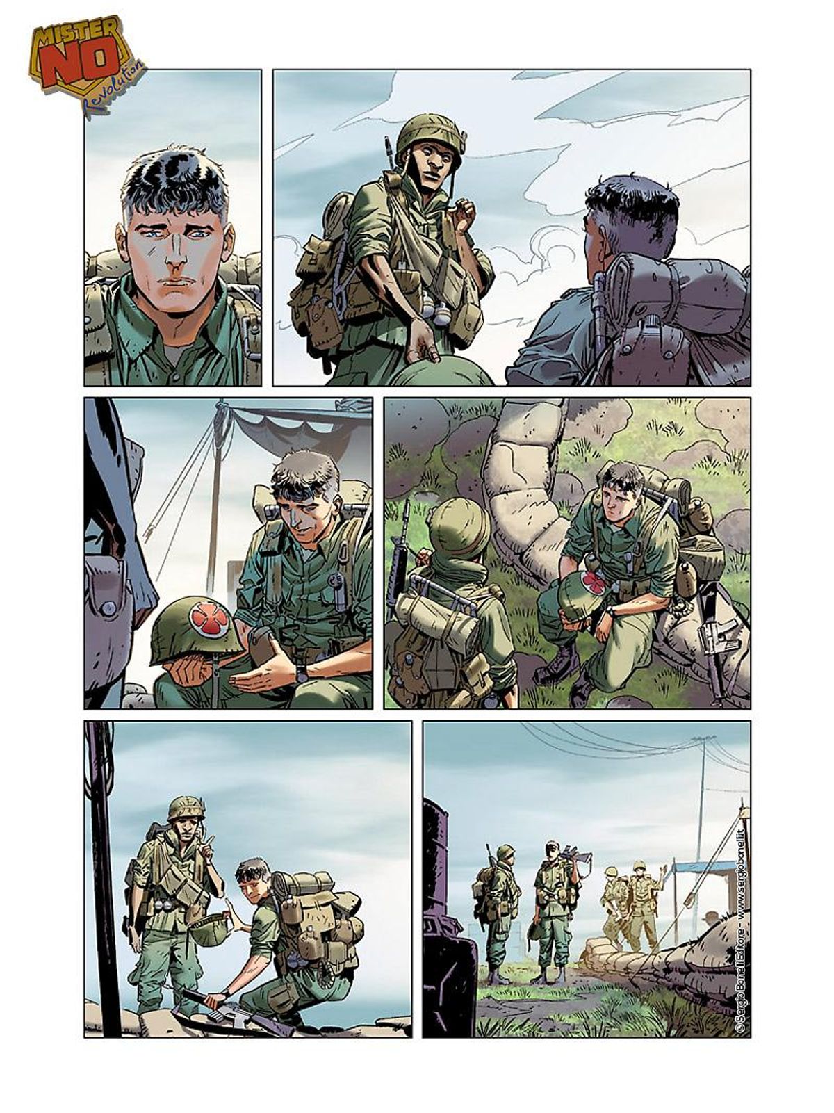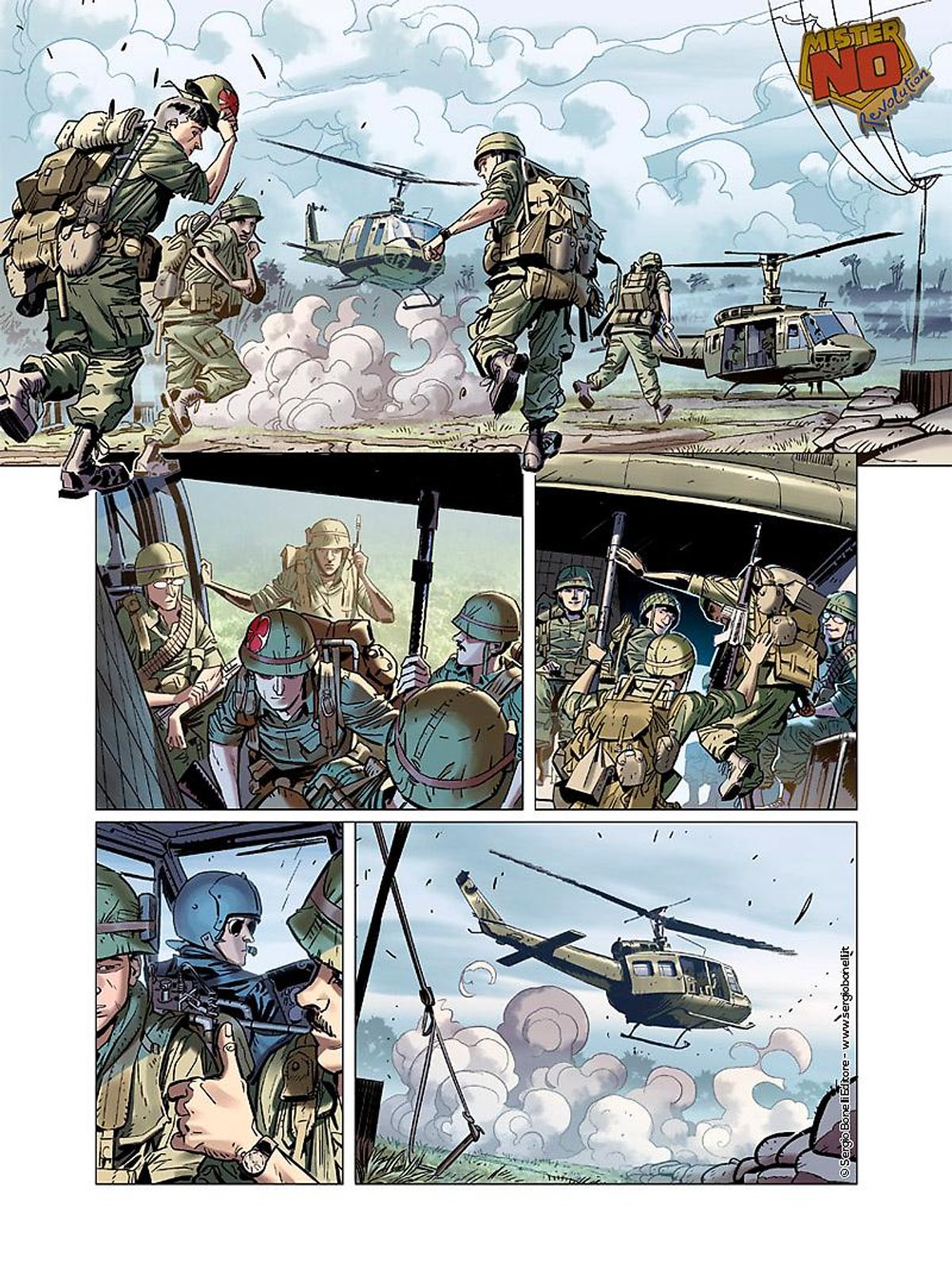 Questa volta, i riflettori sono per la miniserie Mister No Revolution, di cui vi mostriamo la splendida copertina di Emiliano Mammucari. Vietnam (22 x 30 cm, 144 pp., col., 23,00 Euro) è il primo dei tre cartonati di cui si articola l'opera; è previsto in fumetteria per l'8 novembre, ma sarà già disponibile a Lucca Comics. Lo stesso progetto, suddiviso nei sei albi dell'edizione economica, debutterà a dicembre nelle edicole con Brucia, ragazzo, brucia! (17 x 23 cm, B, 64 pp., col., 3,50 Euro).Mister No Revolution, come vi abbiamo già racconto lo scorso agosto, è la rivisitazione moderna di Jerry Drake, l'antieroe creato da Guido Nolitta, alias Sergio Bonelli, nel 1975. Il compito tutt'altro che facile di realizzare questo ambizioso What if…? è stato affidato al direttore editoriale Michele Masiero, non per nulla ex curatore della testata regolare di Mister No. I disegni di Vietnam sono invece di Matteo Cremona per i colori di Luca Saponti e Giovanna Niro.