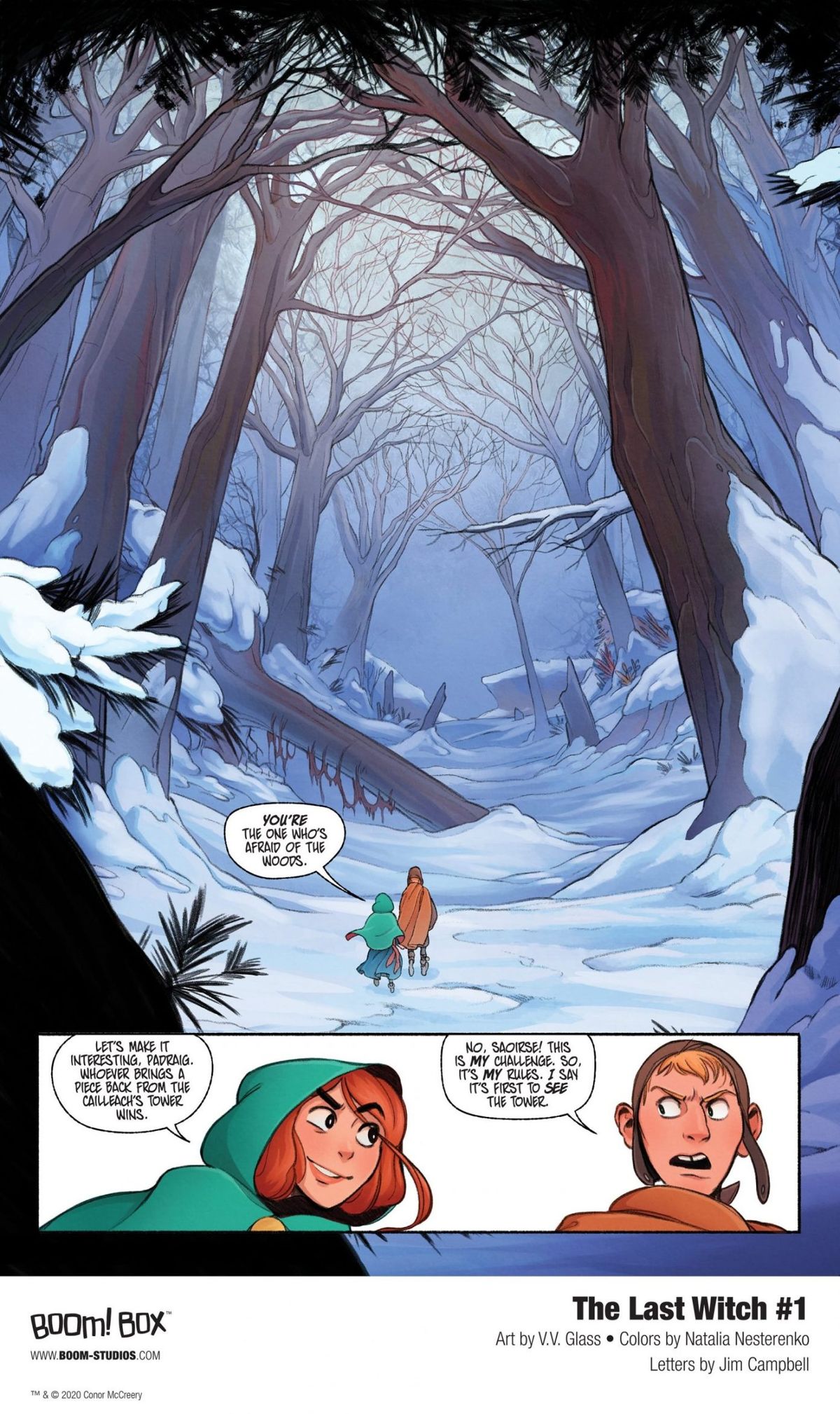 I BOOM! Studios hanno annunciato la nuova serie fantasy per ragazzi Last Witch, che esordirà sugli scaffali americani il prossimo 6 gennaio. Il primo numero sarà scritto da Conor McCreery (Assassin's Creed), disegnato da V.V. Glass (Tammy & Jinty Special) e colorato da Natalia Nesterenko (Fathom), con due variant cover di Jorge Corona (Middlewest) e Peach Momoko (Wynd).Questa la sinossi ufficiale diffusa dalla casa editrice: