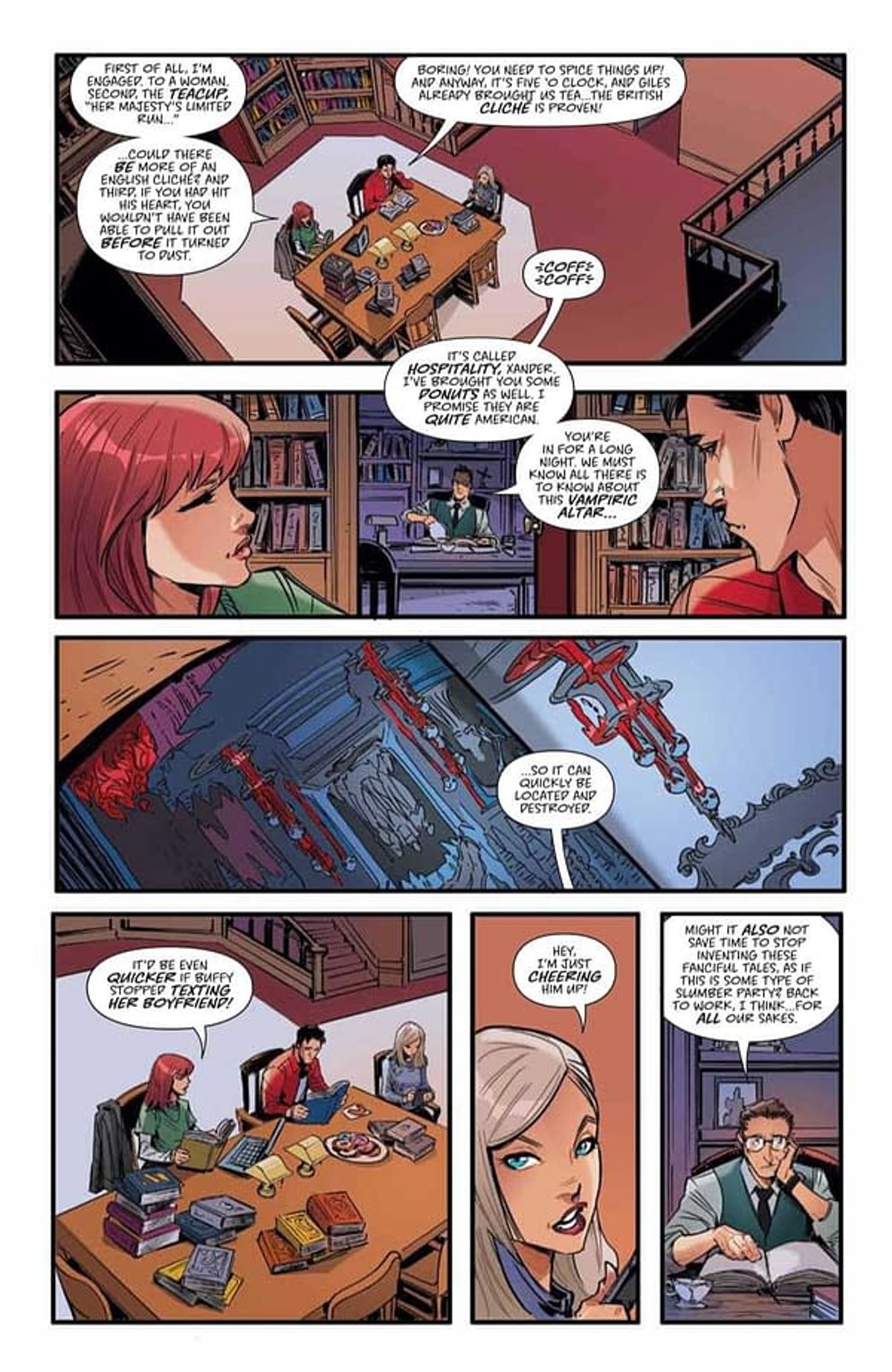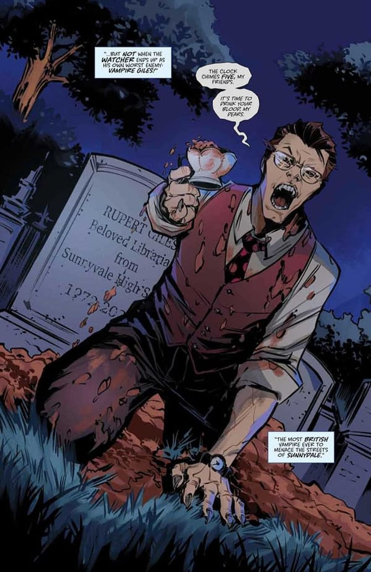 Esce oggi sugli scaffali americani Tea Time, lo spin-off del reboot a fumetti di Buffy l'Ammazzavampiri incentrato sul personaggio di Rupert Giles, scritto da Mirka Andolfo (Sweet Paprika) e disegnato da Siya Oum (Lola XOXO).In questa storia l'Osservatore sarà però presentato in una versione inusuale, visto che sarà un vampiro; non si conosce ancora come il personaggio si sia trasformato, anche se recentemente è stato introdotto il multiverso di Buffy, dietro il quale si potrebbe celare la spiegazione di questo incipit.Questa la sinossi ufficiale diffusa dai BOOM! Studios: