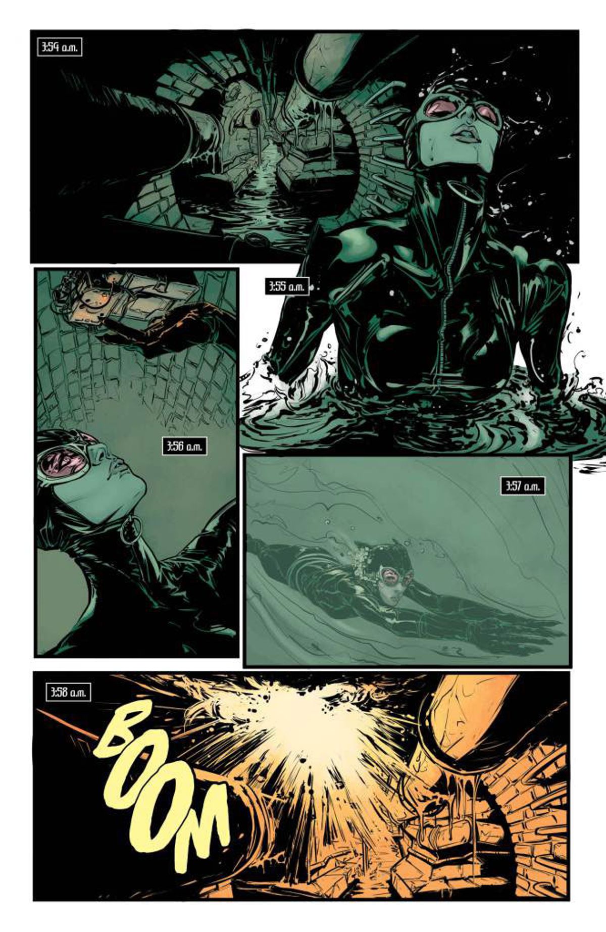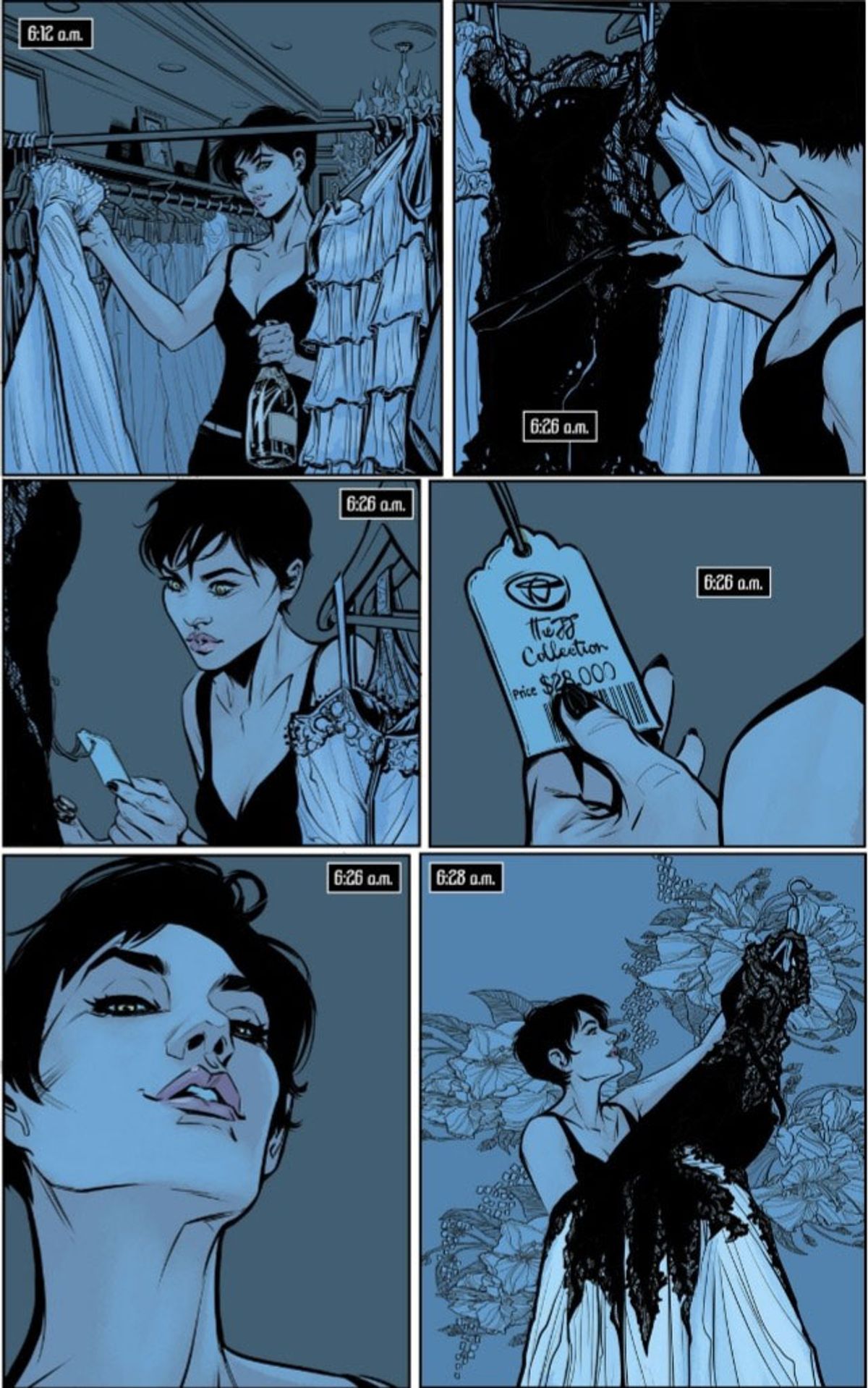 All'inizio di tutto, il mio piano era quello di avere un gatto nella stanza in cui Selina sceglie il suo vestito da sposa, di farla parlare per tutto il tempo. Stavo scrivendone il monologo, ma era orribile. Ho capito che tutte quelle parole erano un intralcio e non ne avevo bisogno. Avrebbero fatto da ostacolo ai disegni. Quindi, ho cancellato lo stupido gatto e i discorsi. Ecco come è nata la scena che avete visto [su Batman #44 - NdR].Jones - Selina è uno dei miei personaggi preferiti dacché ero ragazzina. Venendo da un fumetto come Lady Killer, in cui l'autodifesa personale era così importante nella storia, sono finita a prendere lezioni di Krav Maga. Ho detestato ogni minuto di lezione, ma volevo che le mie scene sulla pagina fossero realistiche. Sono riuscito a usare molto di quel che ho imparato in Lady Killer, e ora, nella gestione del personaggio di Catwoman, essendoci passata in prima persona.