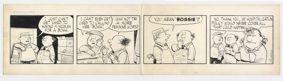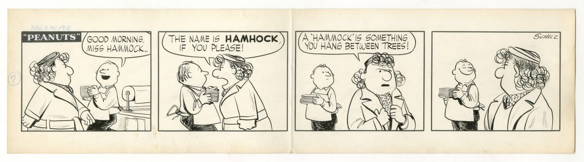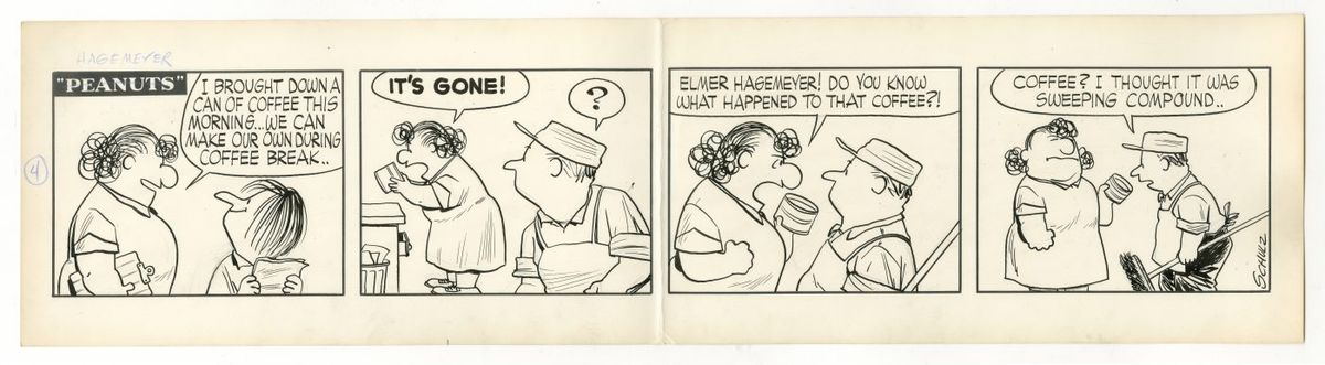 La prossima settimana aprirà al Charles M. Schulz Museum di Santa Rosa, in California, l'esposizione Adults by Schulz che sarà dedicata ai fumetti realizzati del celebre autore dei Peanuts con personaggi adulti. Si va da Young Pillars, incentrato su un gruppo di adolescenti, a It's Only a Game che rappresenta diverse discipline sportive; l'opera più interessante sono però le sette strisce di Hagemeyer, qui esposte per la prima volta assieme.A metà degli anni '50, Schulz voleva provare a realizzare altri fumetti oltre ai Peanuts, così provò a proporre Hagemeyer al suo editore, il quale però gli rispose di concentrare i suoi sforzi sulle avventure di Charlie Brown e compagni. Il protagonista è il mite impiegato Elmer Hagemeyer che deve sottostare alle urla della sua dispotica dirigente Miss Hamhock.