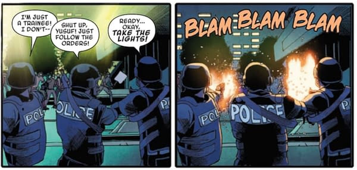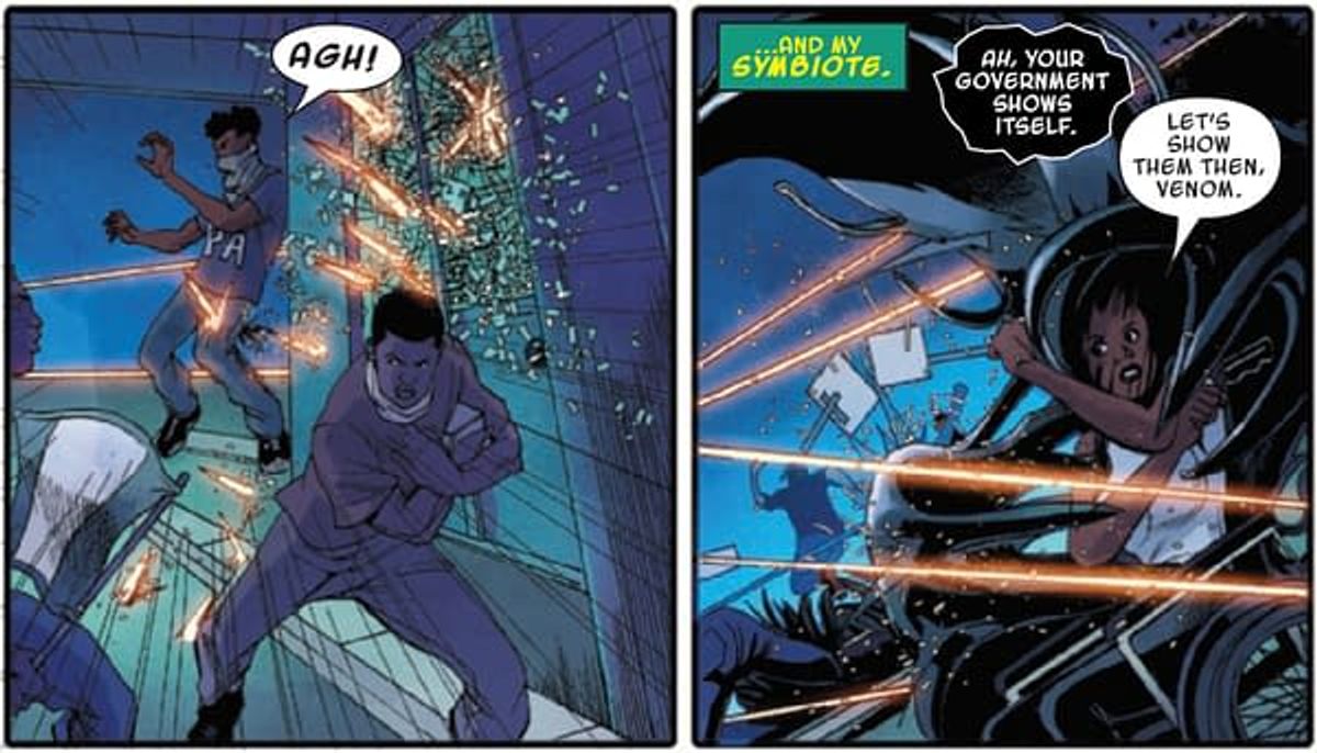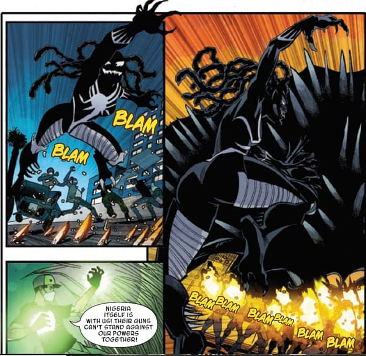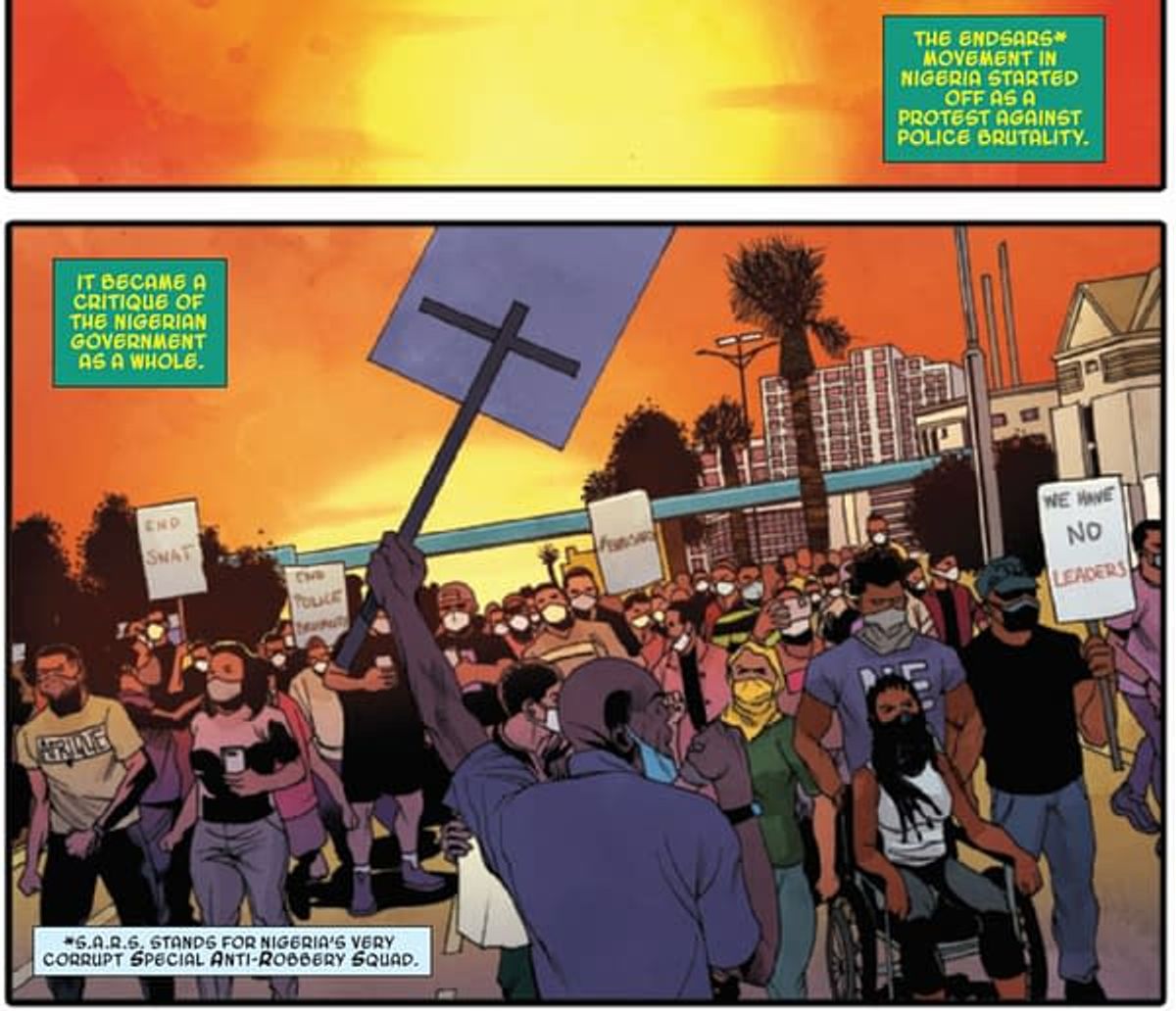 La storia si apre con una manifestazione di protesta contro gli abusi degli ufficiali nigeriani; ben presto, la folla diventa bersaglio dei colpi di arma da fuoco dei poliziotti che vengono bloccati solo grazie all’intervento di Ngozi, che utilizza il suo simbionte per evitare morti innocenti.Di seguito trovate una gallery in cui sono state raccolte le tavole tratte da Marvel's Voices: Legacy in cui possiamo vedere Ngozi in azione.