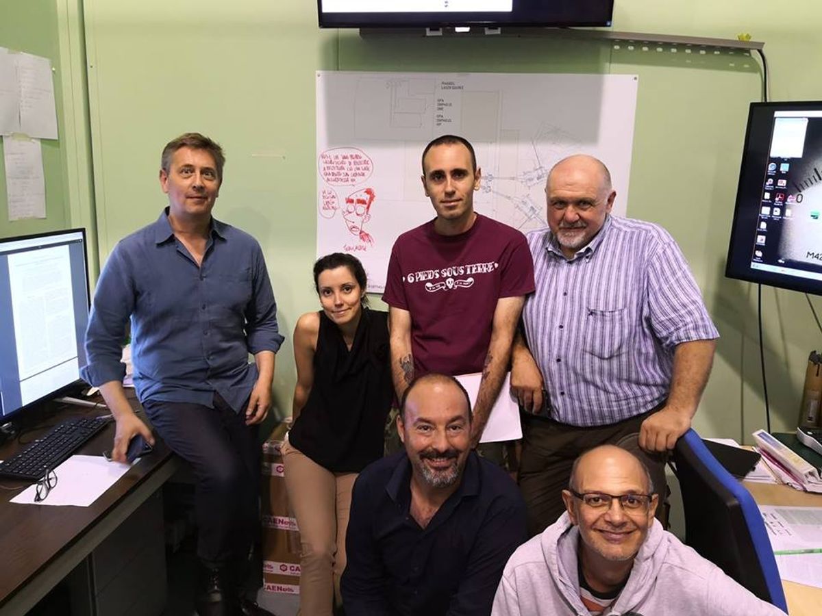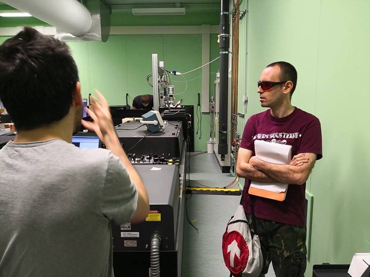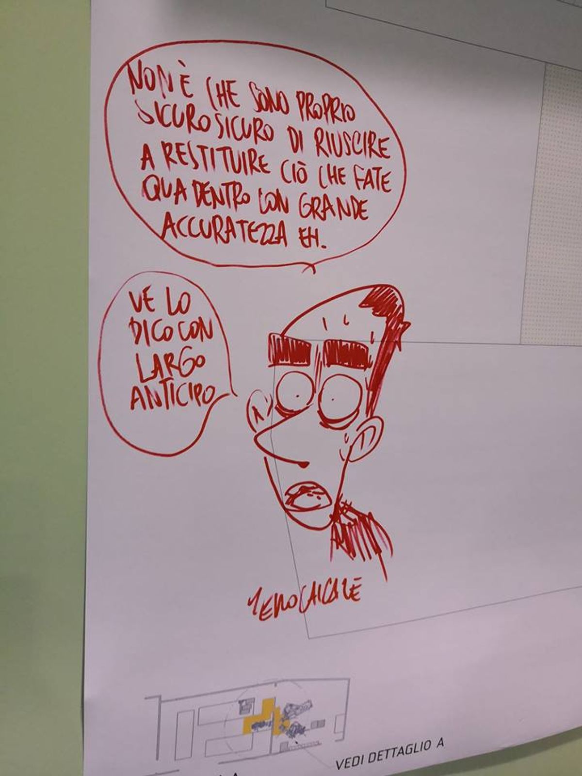 Nella vignetta il fumettista lascia intendere ironicamente di non averci capito molto, descrivendo il tutto come un circuito in cui vengono organizzate corse clandestine tra elettroni. Qui sotto potete vedere alcune foto della visita, nelle quali è possibile vedere un disegno che l'autore romano ha lasciato su una parete dell'istituto di ricerca.Galleria