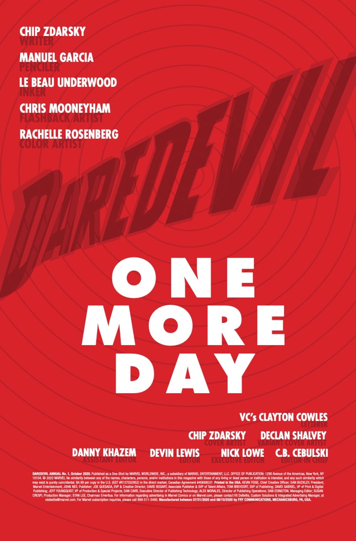In chiusura, vi ricordiamo che esce oggi negli Stati Uniti il primo annual della serie, scritto da Zdarsky per i disegni di Manuel Garcia (Bloodshot) e Chris Mooneyham (Five Ghosts). Come vi avevamo anticipato in una precedente news, il titolo dell’albo - la scritta “One More Day”, ossia “Soltanto un altro giorno”, con la “D” che ricalca il logo del Cornetto - evoca ricordi non troppo felici ai fan di Spider-Man: il pensiero, infatti, ritorna subito al controverso crossover del 2007 di J.M. Straczynski e Joe Quesada, in cui il matrimonio tra Peter Parker e Mary Jane venne cancellato da uno scellerato patto con Mefisto.In attesa di scoprire se nello speciale di quaranta pagine qualcosa cambierà per Matt, date uno sguardo alla gallery in basso, dove trovate raccolte le prime pagine dell’albo.