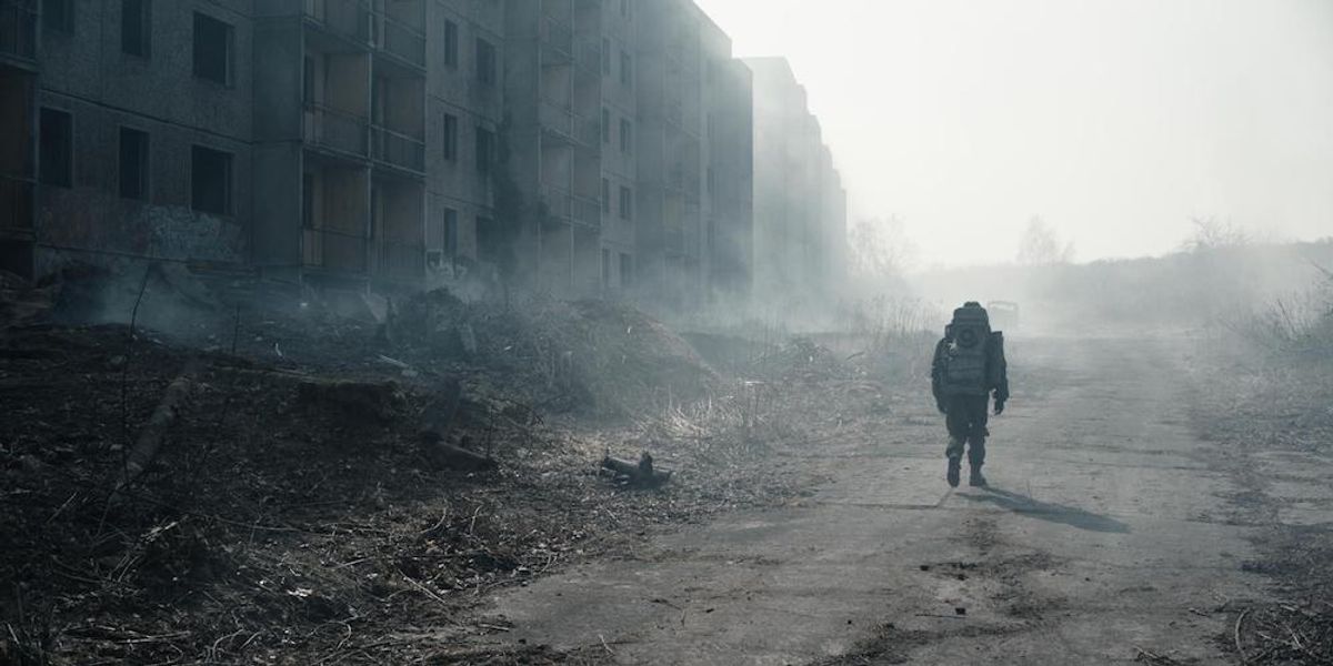 In una foto vediamo un'ambiente urbano deserto, con una persona in una tuta protettitiva e un apparato per la respirazione sulla schiena. Nell'altra foto lo vediamo in primo piano, una bandana gialla a coprirgli il volto.