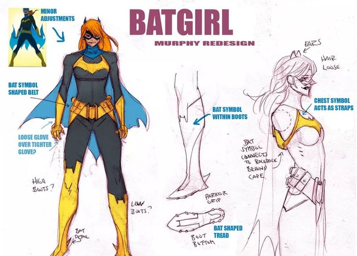 In effetti, nel design di Murphy è evidente un ritorno alle origini, specialmente dal punto di vista cromatico. La più grande novità è però rappresentata dall'assenza un vero e proprio cappuccio, sostituito da una classica mascherina e dalle iconiche orecchie che fanno capolino dalla capigliatura di Barbara.Dovrebbe essere la versione del suo costume a cui Barbara stava lavorando quando ancora viveva con suo padre. È questo il motivo per cui assomiglia molto all'originale, visto in Batgirl: Anno Uno.