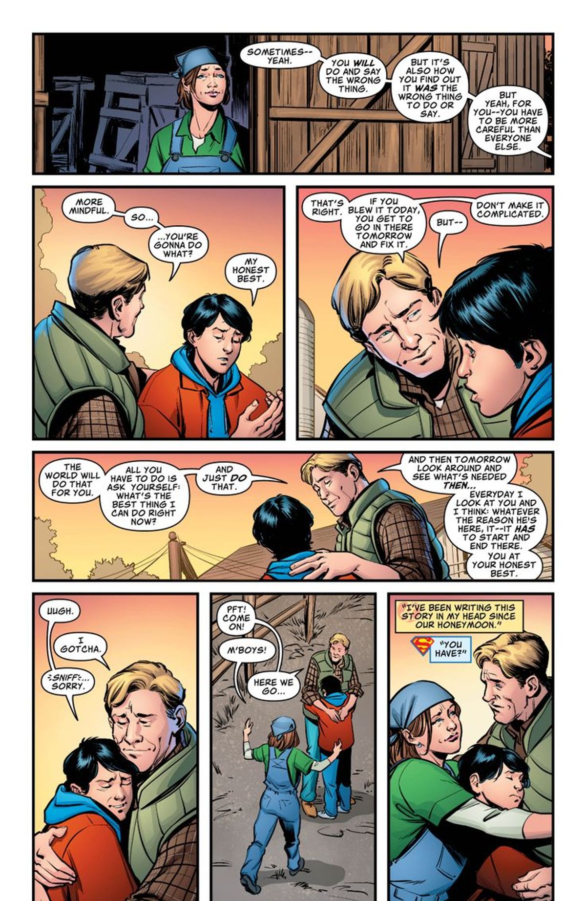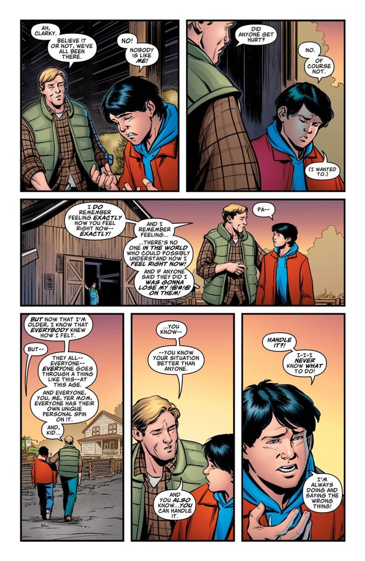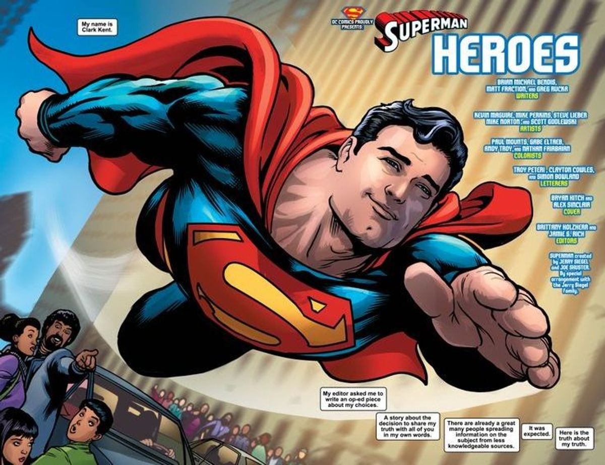 L'imminente speciale Superman: Heroes esplorerà la reazione dei colleghi dell'Uomo d'Acciaio alla sua decisione potenzialmente scioccante e dalle conseguenze ancora tutte da valutare. La storia, tuttavia, si apre con una figura chiave della formazione e della vita di Clark: in flashback, Pa' Kent fa una significativa apparizione per consigliare saggiamente suo figlio adottivo e dargli modo di mettere nella giusta prospettiva le implicazioni della sua rivelazione, ossia: fidarsi di se stesso, fare quel che onestamente crede sia meglio e non complicare troppo le cose.Heroes, che fa da contraltare alle reazioni dei criminali DC Comics narrate in Villains, è scritto dallo stesso Bendis, assieme a Matt Fraction (Jimmy Olsen), Jody Houser (Supergirl) e Greg Rucka (Lois Lane), per le matite di Kevin Maguire, Steve Lieber e Mike Perkins.