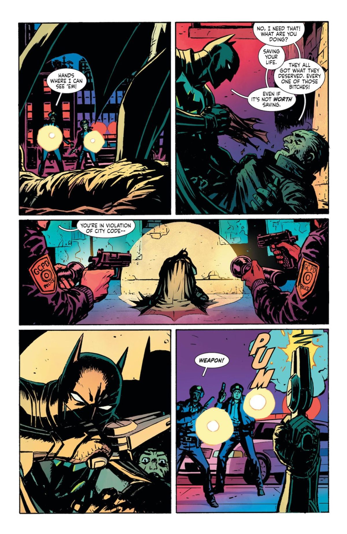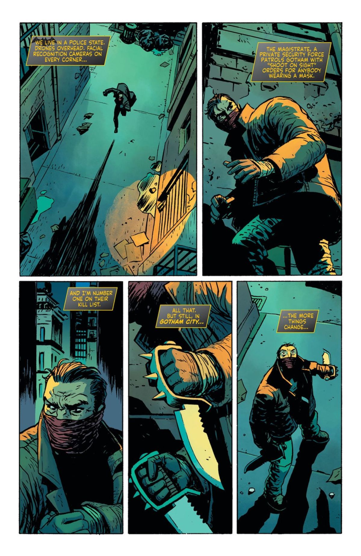 Come vi abbiamo riportato in una precedente news, sotto la maschera dell'Uomo Pipistrello troveremo Tim Fox, il fratello di Luke (Batwing), personaggio creato da Len Wein e Irv Novick recentemente reintrodotto nella continuity DC: sullo speciale Batman: The Joker War Zone #1, Tanya ha suggerito a Lucius di contattarlo e chiedergli di tornare a Gotham.Tim, dunque, si muove in un contesto diverso, in cui le forze dell’ordine adottano tolleranza zero nei confronti di chi indossa una maschera: dopo i tragici eventi dell'A-Day, un’agenzia tecnologicamente avanzata - la Magistrate - è stata chiamata a combattere il crimine, costringendo Batman a tornare all’analogico per sfuggire ai loro spietati metodi.