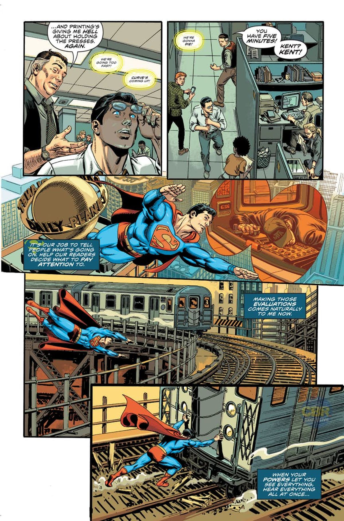 Quando scrivo il personaggio ne enfatizzo soprattutto il senso di responsabilità. A causa dei suoi super sensi, è bombardato di informazioni. Ha un'enorme possibilità di fare del bene, ma, allo stesso tempo, è solo un uomo. Quindi, ha imparato a vagliare, valutare, concentrare i suoi sforzi dove spera di essere più efficiente. La sua esistenza può sembrare ingestibile e anche futile, dato che non può essere ovunque. Non può salvare tutti, ma solo fare del suo meglio. La vita personale, fatta di amici, colleghi, famiglia, la gente di Metropolis, gli ricorda perché i suoi sforzi valgano la pena. Le piccole vittorie sono spesso quelle che contano. Parlano al suo cuore e lo aiutano a mantenersi lucido.