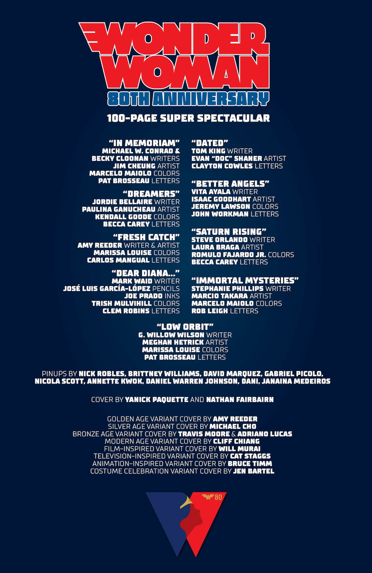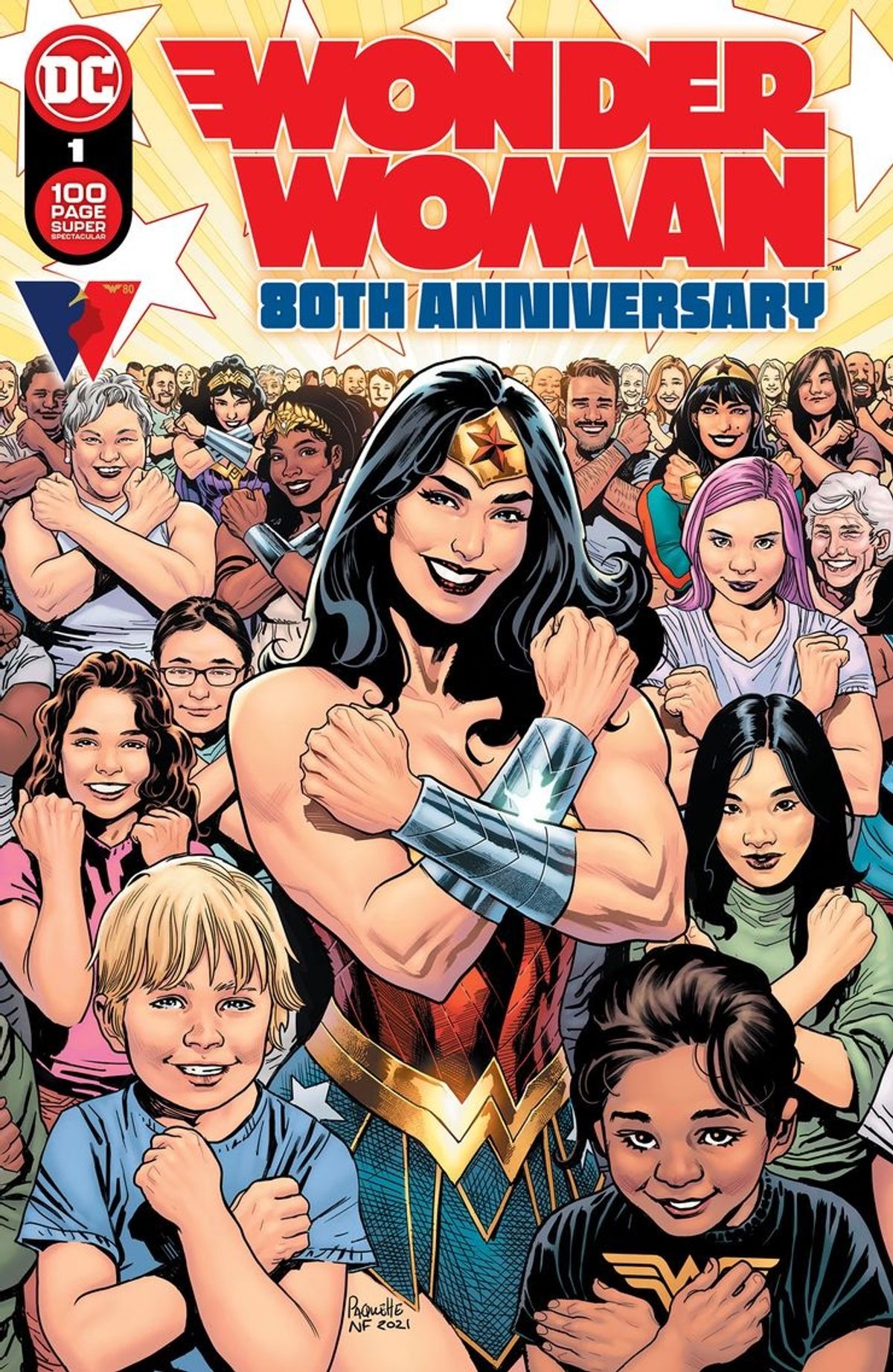 Tra le celebrazioni di questo 2021, troviamo anche gli 80 anni di Wonder Woman, personaggio della DC Comics creato da William Moulton Marston e Harry G. Peters la cui prima apparizione è avvenuta sulle pagine di All Star Comics #8. Tra le iniziative editoriali volte a esaltare questa iconica figura della cultura Pop, troviamo anche uno speciale, Wonder Woman 80th Anniversary 100-Page Super Spectacular #1, che esce oggi negli Stati Uniti.Come abbiamo già avuto modo di raccontarvi in un precedente articolo, si tratta di uno speciale di novantasei pagine in cui i principali autori in forza all'editore di Burbank uniscono le forze per realizzare storie dedicata a Diana Prince. Di seguito l'elenco completo degli artisti coinvolti: Michael Conrad, Becky Cloonan, Amy Reeder, Jordie Bellaire, Yanick Paquette, Nathan Fairbairn, Jim Cheung, Paulina Ganucheau, José L. García López, Laura Braga, Nicola Scott, David Marquez, Gabriel Picolo, Nick Robles, Joe Prado, Evan Shaner, Meghan Hetrick, Dani Strips, Marcio Takara, Isaac Goodhart, Brittney Williams, Janaina Medeiros, Daniel Warren Johnson, Marissa Louise, Trish Mulvihill, Romulo Fajardo, Marcelo Maiolo, Annette Kwok, Jeremy Lawson, Kendall Goode.Vi ricordiamo che in precedenza la DC Comics aveva dato il via alle celebrazioni con la campagna globale ribattezzata Believe in Wonder, che culminerà il prossimo 21 ottobre con il Wonder Woman Day. Nel frattempo, sono stati già presentati su DC Universe Infinite diversi contenuti digitali: dallo storico All-Star Comics #8, a Sensation Comics #1 e Wonder Woman #1. Inoltre, sono disponibili l’antologia Wonderful Women ofHistory e il primo volume di Sensational Wonder Woman, serie digitale che ha esordito lo scorso gennaio.