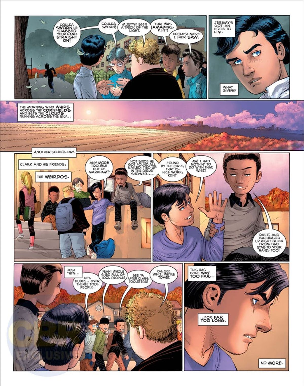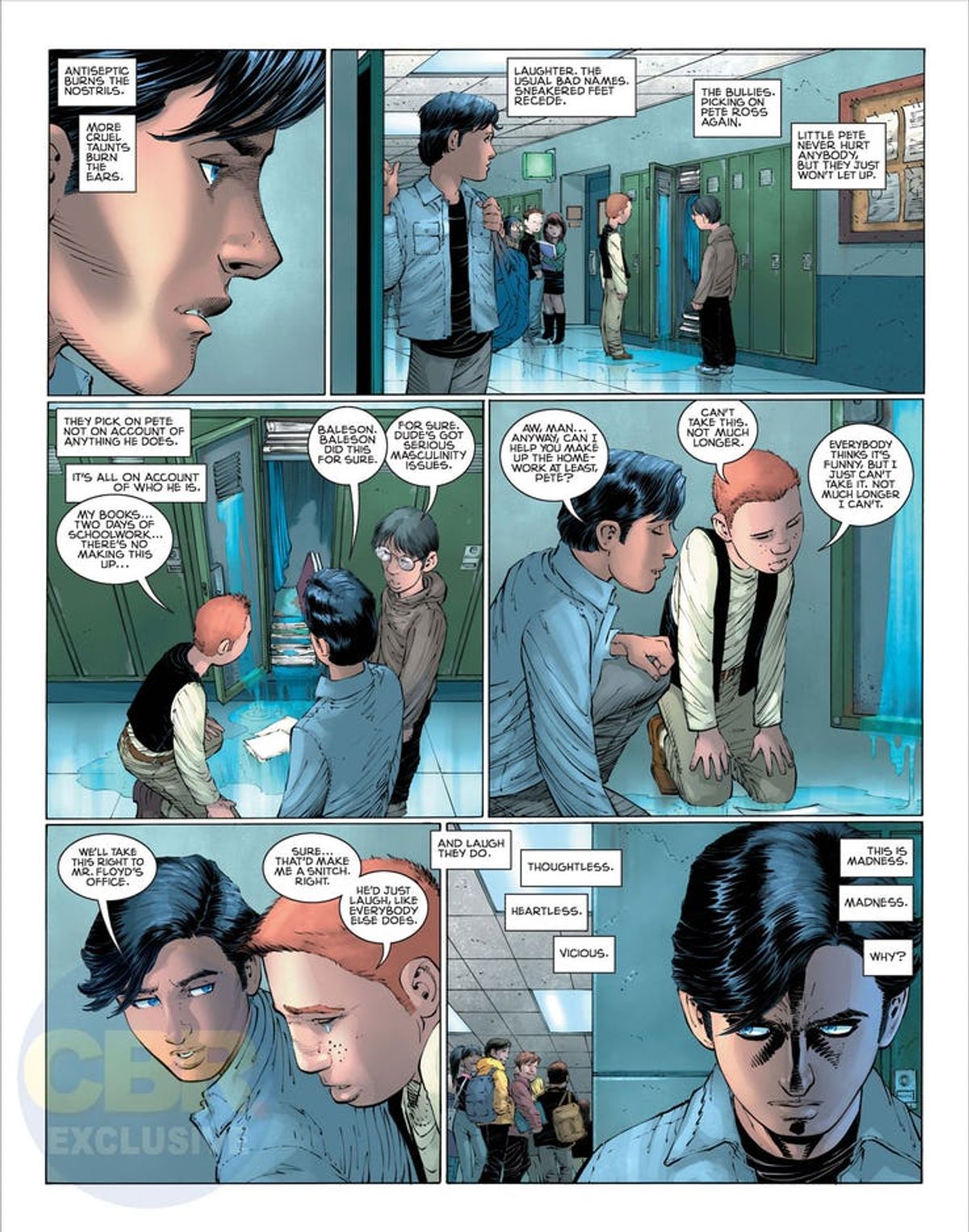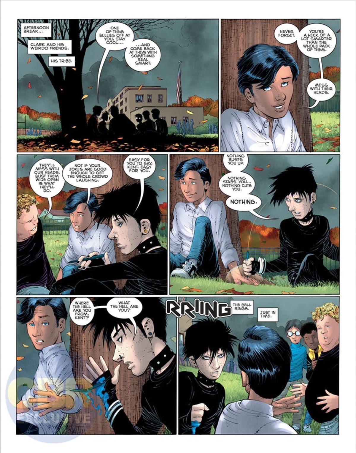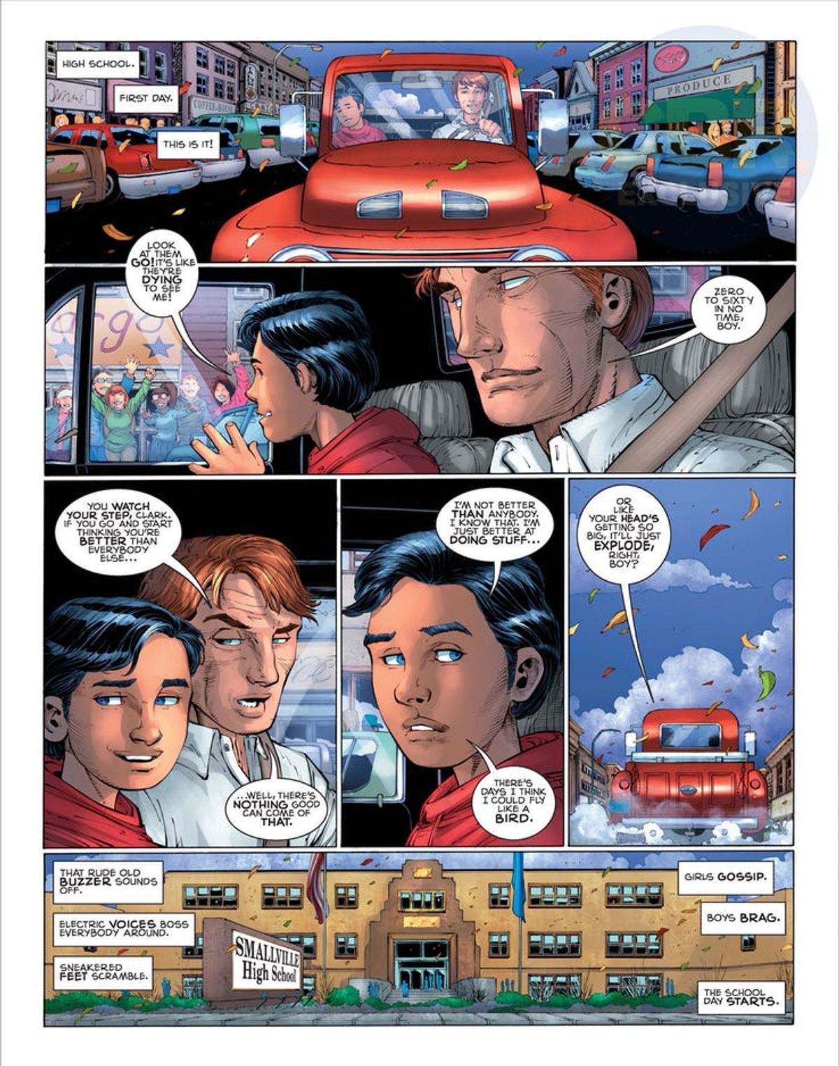 Adoro questo processo. Fa paura, perché si tratta di duecento pagine e c'è un sacco di spazio in cui perdersi, un sacco da riempire. E non ho fatto tanto riferimento al passato noto di Superman, nel lavorarci, quanto più a situazioni che conosco io, dai tempi della scuola. Il football, il rapporto con i bulli, le cotte adolescenziali. Laddove ho potuto, ho riutilizzato le mie esperienze giovanili.