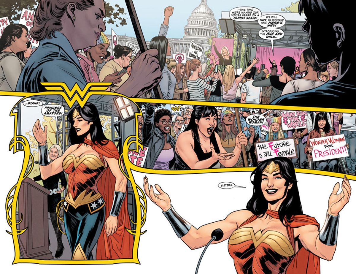 I titoli Earth One sono posti in universi molto contemporanei e credibili, e la nostra storia mostra, con semplicità, quel che accadrebbe se le idee di Marston, alla base del personaggio, venissero prese sul serio. Erano vedute bizzarre. Poste in un contesto politico e di visione di genere contemporaneo, diventano provocazioni piuttosto estreme. Questa è la linea che abbiamo seguito, proponendovi le amazzoni come ve le abbiano mostrate: una razza separatista di donne potentissime e tecnologicamente avanzate.La loro idea di pace è controllare gli uomini e dir loro come comportarsi. Usano il controllo mentale sui nemici senza alcun problema. Non usano bombe o armi tradizionali come le amazzoni viste in passato. Controllano la tua mente. E, in questo contesto storico, si tratta di un concetto molto interessante. Vedere una società come quella, molto potente, a confronto con la nostra contemporanea e la politica dei nostri giorni, è qualcosa di potenzialmente incendiario.
