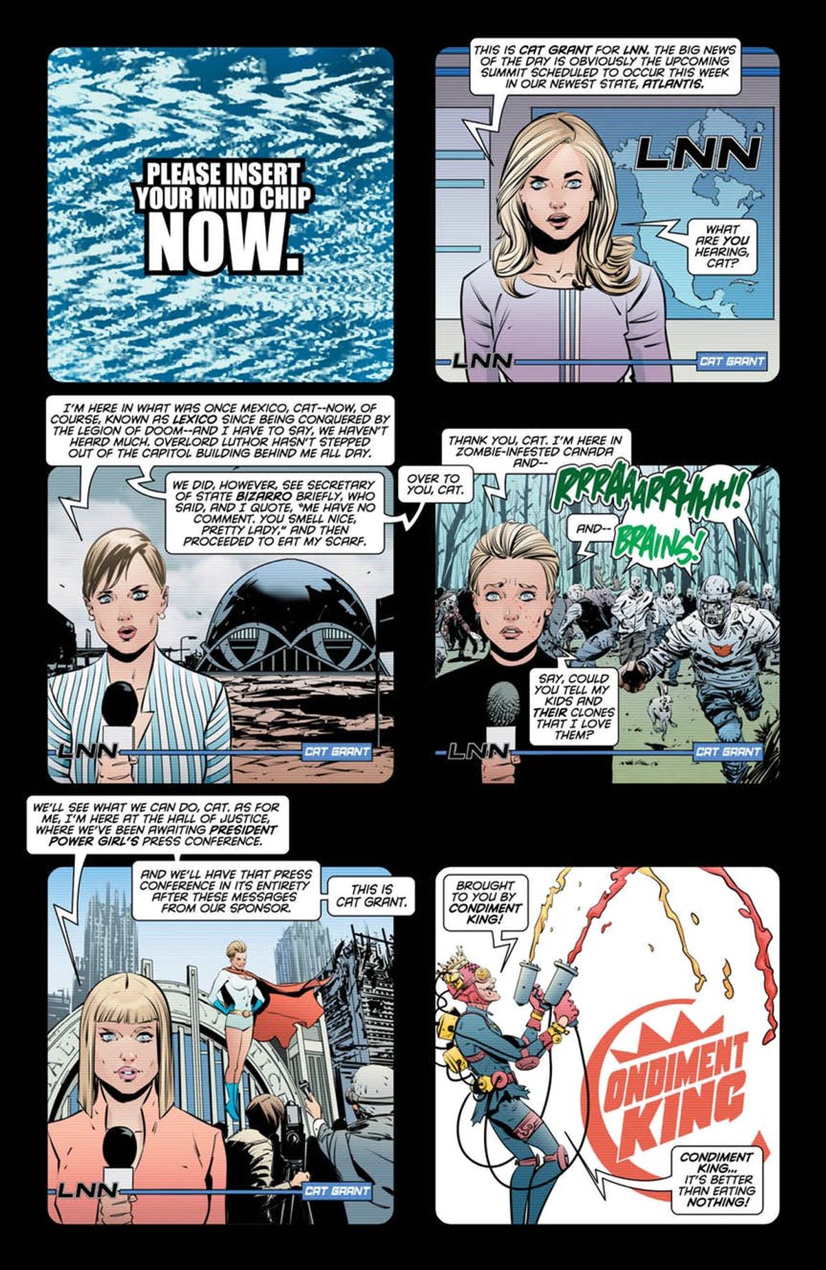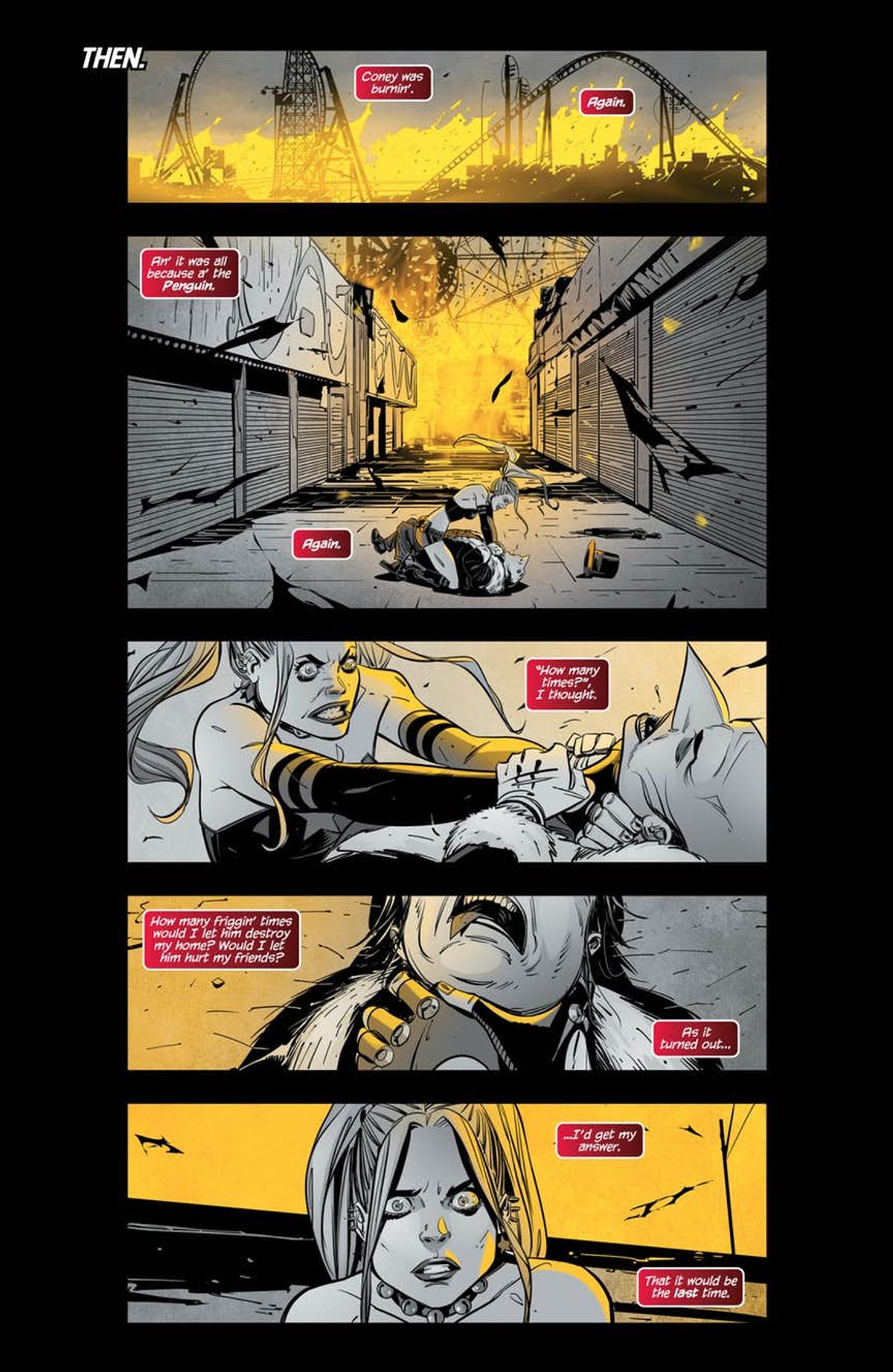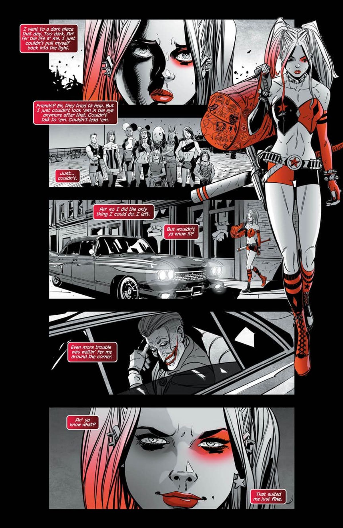Fondamentalmente, cinque anni nel futuro dell'attuale Universo DC, lei ha perso il controllo e assassinato il Pinguino. E questa azione l'ha posta su un sentiero fatto di oscurità e senso di colpa, da cui non si è mai davvero ripresa, nemmeno altri venticinque anni dopo. Si dice che un singolo evento sia in grado di cambiare la tua vita. Per Harley è stato proprio così.E anche il mondo è sicuramente cambiato. In questo futuro, il Canada è ormai infestato da zombi. Il Messico è stato conquistato dalla Legione del Destino, e ribattezzato Lexico. Atlantide è il cinquantunesimo Stato. Buona parte degli Stati Uniti sono stati devastati, e sono governati da una vecchia amica di Harley, il Presidente Power Girl.