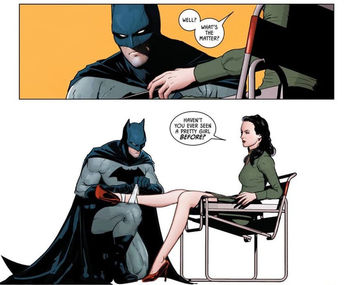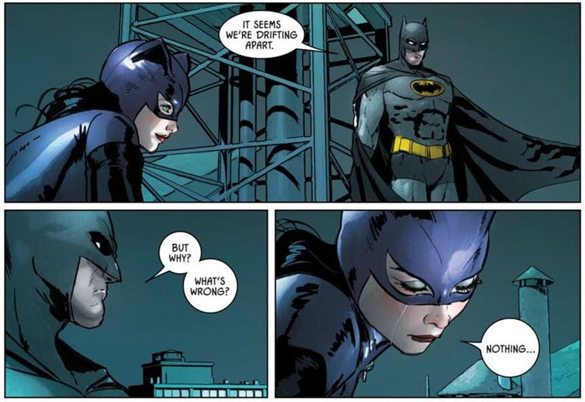 Nel frattempo oltreoceano è stato pubblicato Batman #44, contenente una storia firmata da King, Janín e Joëlle Jones che ripercorre alcune delle tappe più importanti del passato del Crociato Incappucciato e Catwoman. Su quelle pagine, i lettori hanno avuto modo di assistere a una rivisitazione della prima apparizione di Selina Kyle, narrata sulle pagine di Batman #1 (1940), quando il personaggio era semplicemente noto come la Gatta e non aveva un vero e proprio costume, con il Cavaliere Oscuro impegnato a sventare la sua prima rapina.Si passa poi a un episodio di Batman #62 (1950), con l'esordio della celebre tutina viola (con mantello verde) di Catwoman, che in quell'occasione salvò la vita del suo futuro amante. Nel flashback di Detective Comics #203 (1954), viene ricordato quando Selina aveva momentaneamente abbandonato la sua carriera di ladra, salvo poi ripensarci.