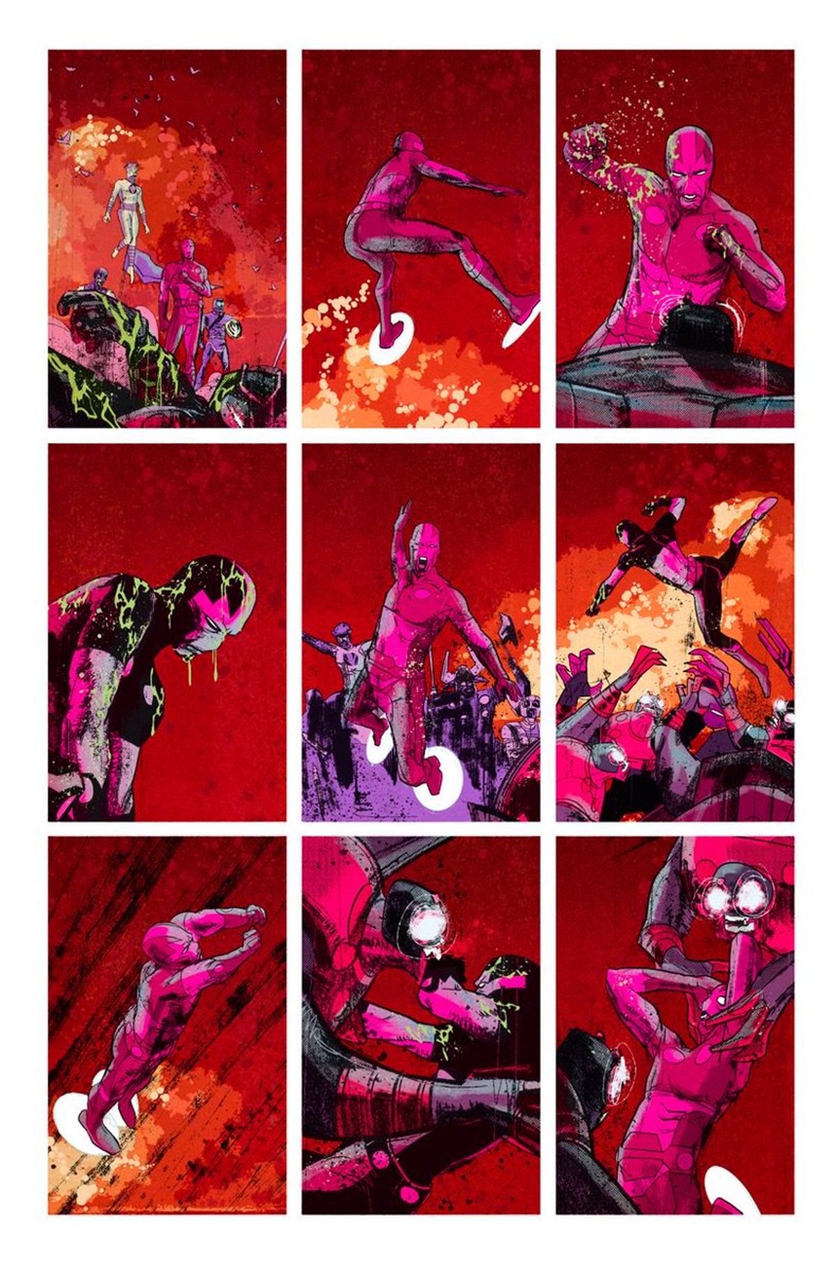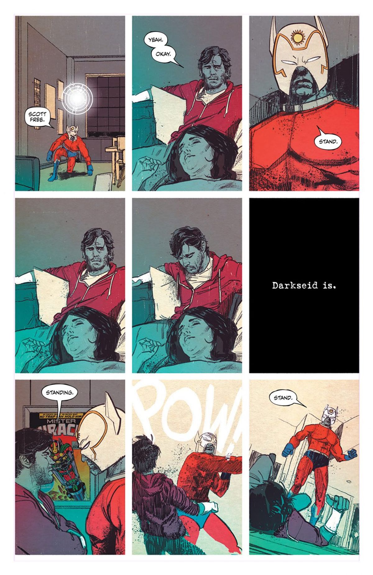 Per quanto riguarda Mister Miracle e il suo peculiare stile visivo, il fatto è che, quando io e Tom iniziammo a lavorare alla serie, non avevamo per le mani un personaggio popolare. Direi che un buon novantacinque percento delle persone che l'hanno letta hanno conosciuto sulle sue pagine il personaggio di Mister Miracle. Quindi, all'inizio della serie, noi ci siamo potuti infilare tra le crepe del sistema editoriale. Era un po' come se nessuno facesse davvero caso a quel che facevamo, perché gli occhi di tutti erano su Batman, o cose così.Grazie a questo fatto, però, io ho potuto sviluppare questo stile bizzarro che mi è stato concesso proprio perché nessuno faceva attenzione. E poi, quando gli occhi si sono spostati su di noi, la serie era cosa fatta, quindi ho semplicemente continuato. Quindi mi posso permettere di divertirmi con un sacco di influenze artistiche e utilizzare moltissimi riferimenti che non credo mi sarebbero permessi su un titolo più in vista. Ad esempio, un sacco di stili presi da disegnatori degli anni Cinquanta o Sessanta.