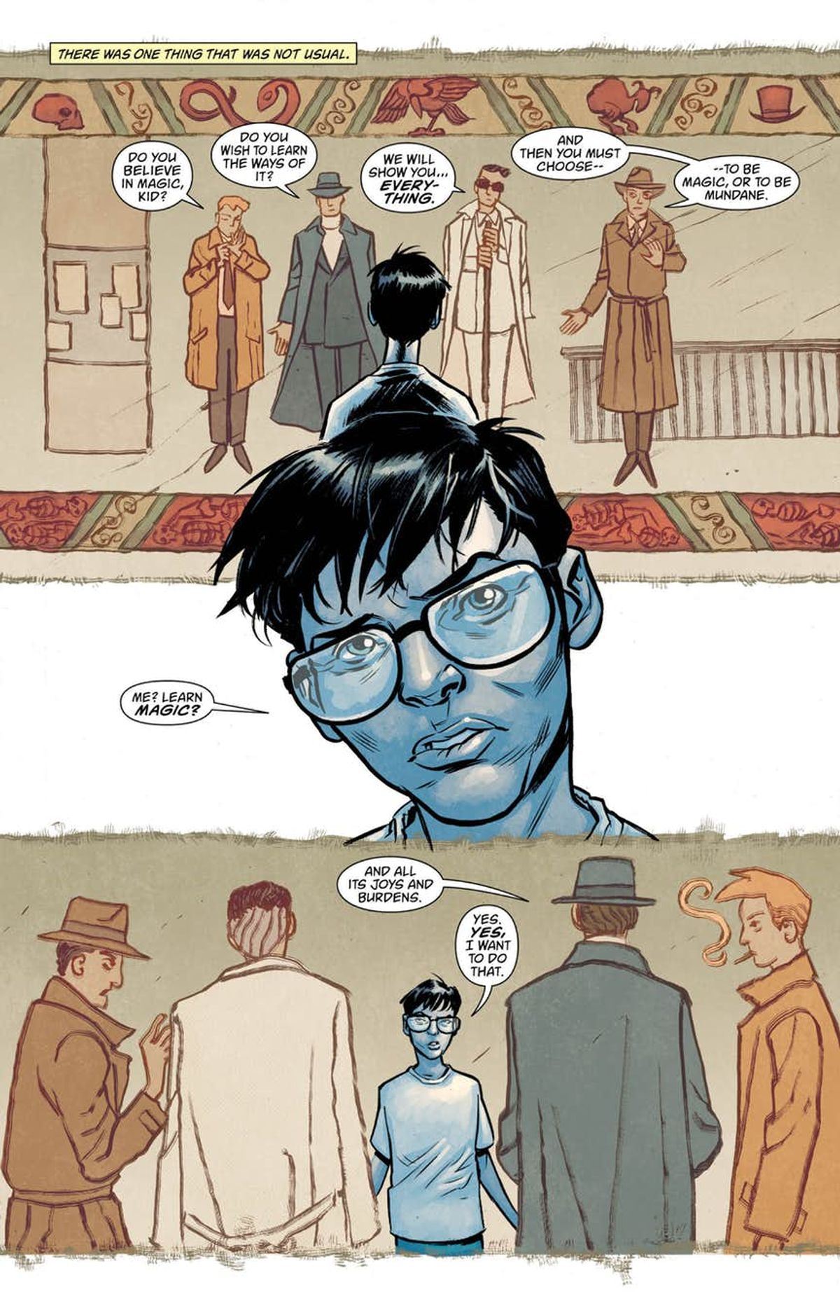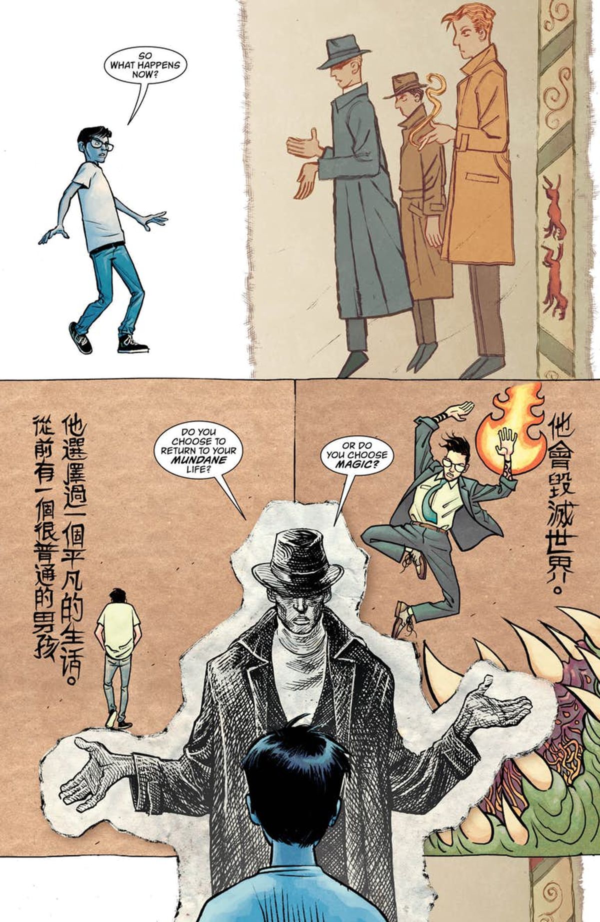 Fowler - La sceneggiatura originale diceva che le didascalie di apertura dovevano essere simili a quelle di un manoscritto medievale istoriato, ma ho pensato che, in un fumetto che cita nel titolo libri di magia, plurale, fosse divertente richiamare piattaforme narrative di un po' tutto il mondo. Quindi, accanto alle miniature da manoscritto medievale europeo, ho tentato di ritrarre anche tavolette di argilla assire, indiane, del Medio Oriente, e i manoscritti cinesi, artisti come Gustave Dorè e Arthur Rackham. Fino a Steve Ditko e Jack Kirby. Volevo mostrare l'importanza della lingua scritta nella cita di Tim e farlo tramite il linguaggio visuale.Ormai abbiamo piene le orecchie delle analogie tra il Fumetto e il Cinema. Si tratta del paragone migliore che abbiamo a disposizione. I personaggi sono i nostri attori sulla pagina e devono occupare e abitare lo spazio come se respirassero e fossero vivi. Sfortunatamente significa che noi dobbiamo costruire letteralmente quello spazio, per fare in modo che possano muoversi e interagire. Il che rende forse i fumetti più simili al teatro.