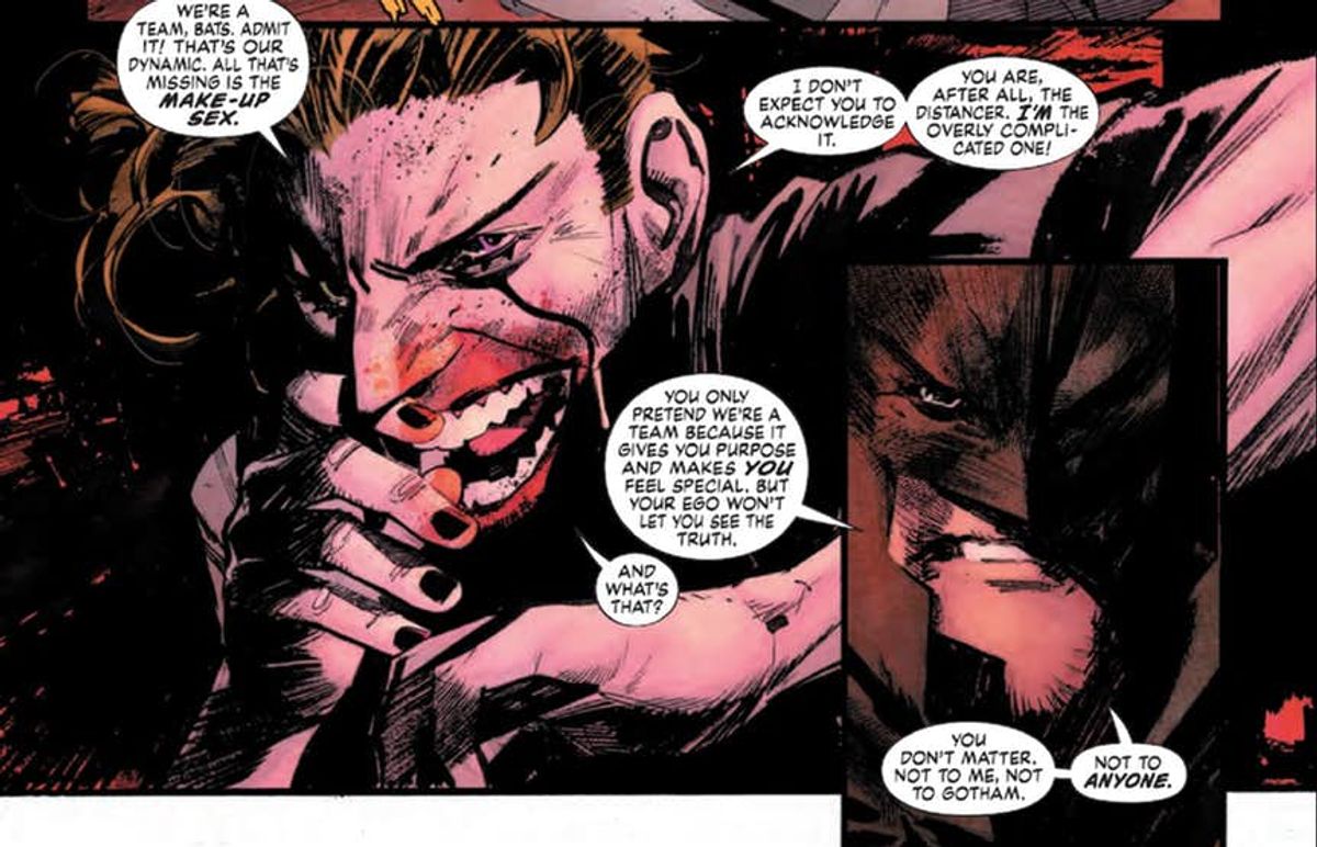 Joker vede questo rapporto come una sfida d'amore, mentre Batman non ne vuole sapere, e la storia ruota tutta attorno al fatto che Joker deve accettare che Batman abbia fondamentalmente rotto con lui.