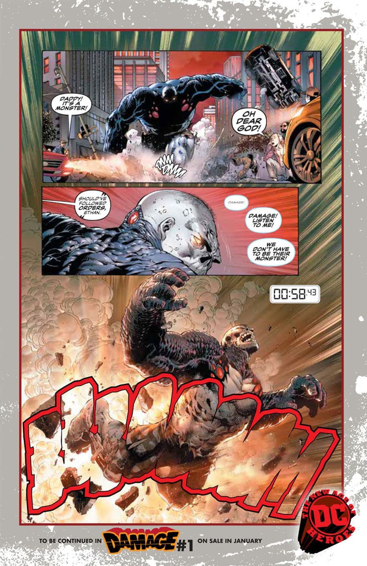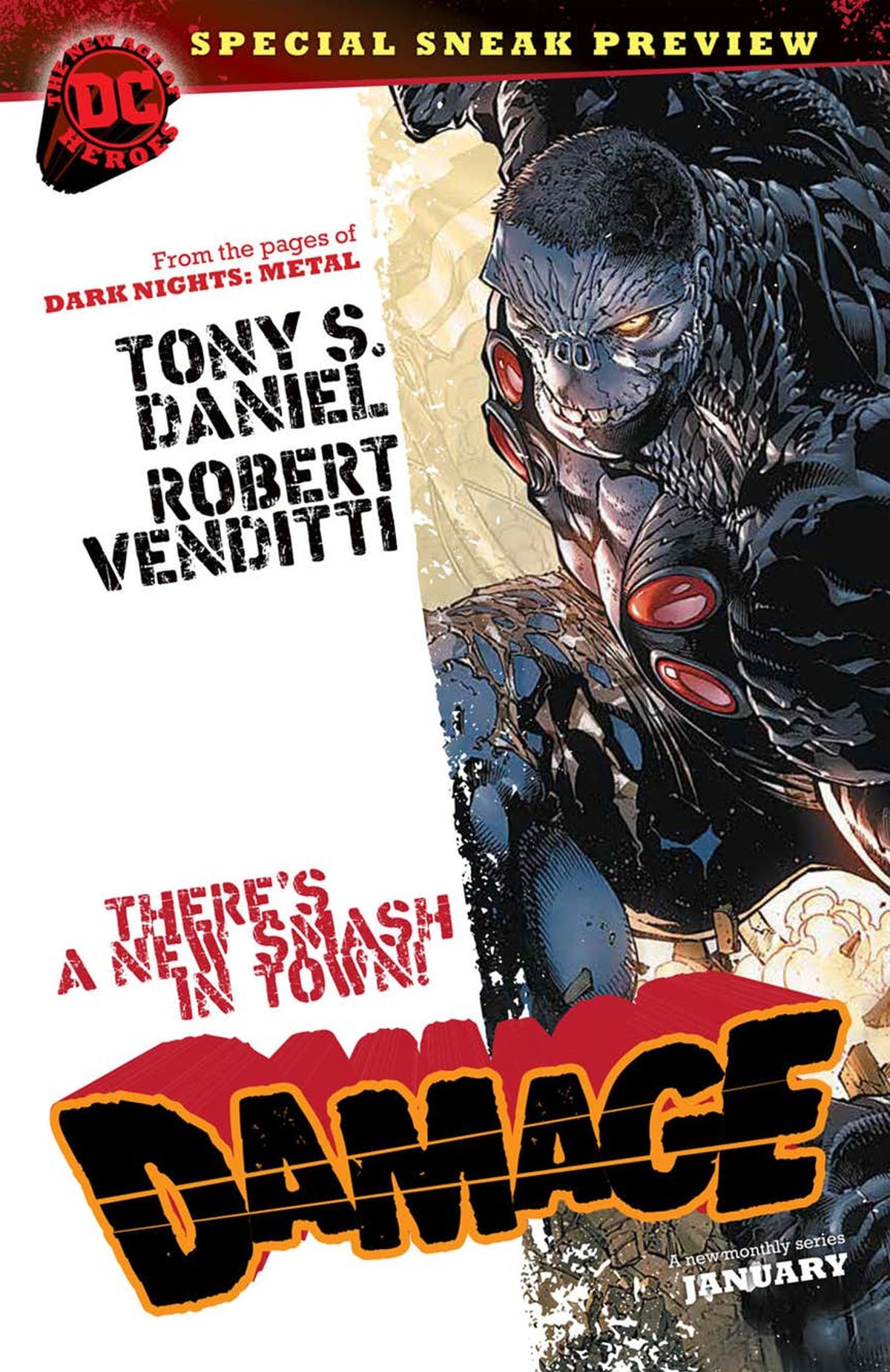 La DC Comics ha diffuso l'anteprima letterata del numero #1 di Damage, nuova serie della linea The New Age of Heroes, in uscita il prossimo 17 gennaio negli Stati Uniti. Il titolo è curato dal team creativo composto da Robert Venditti (testi), Tony S. Daniel (matite), Danny Miki (chine) e Tomeu Morey (colori).Di seguito, vi proponiamo la sinossi ufficiale di Damage e una gallery sfogliabile con le prime pagine.