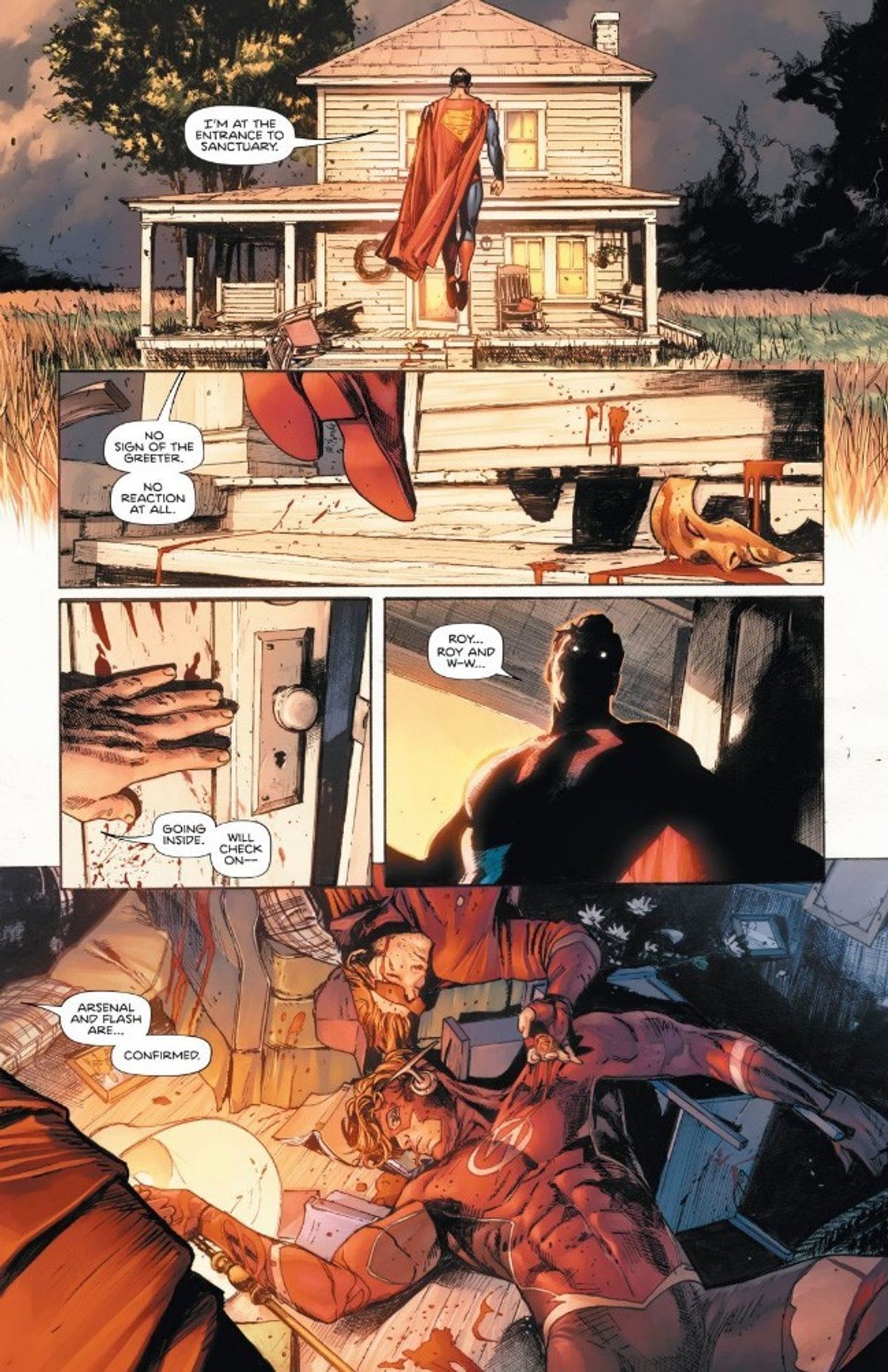 Non è tutto: quando Superman entra nell'edificio trova altri due corpi esanimi: Arsenal (Roy Harper) e Flash (Wally West). Sono loro due i super eroi più noti assassinati. Se da un lato la morte di Roy era stata in qualche modo anticipata da rumour che si rincorrevano nelle ultime settimane, nessuno si aspettava che Wally potesse essere tra le vittime, visto che il personaggio è tornato solo un paio di anni fa, dopo essere rimasto isolato per molto tempo in un limbo della Forza della Velocità, a seguito degli eventi di Flashpoint. Proprio il ritorno dell'ex Kid Flash aveva infatti innescato gli eventi di Rinascita, il più recente rilancio della DC Comics.