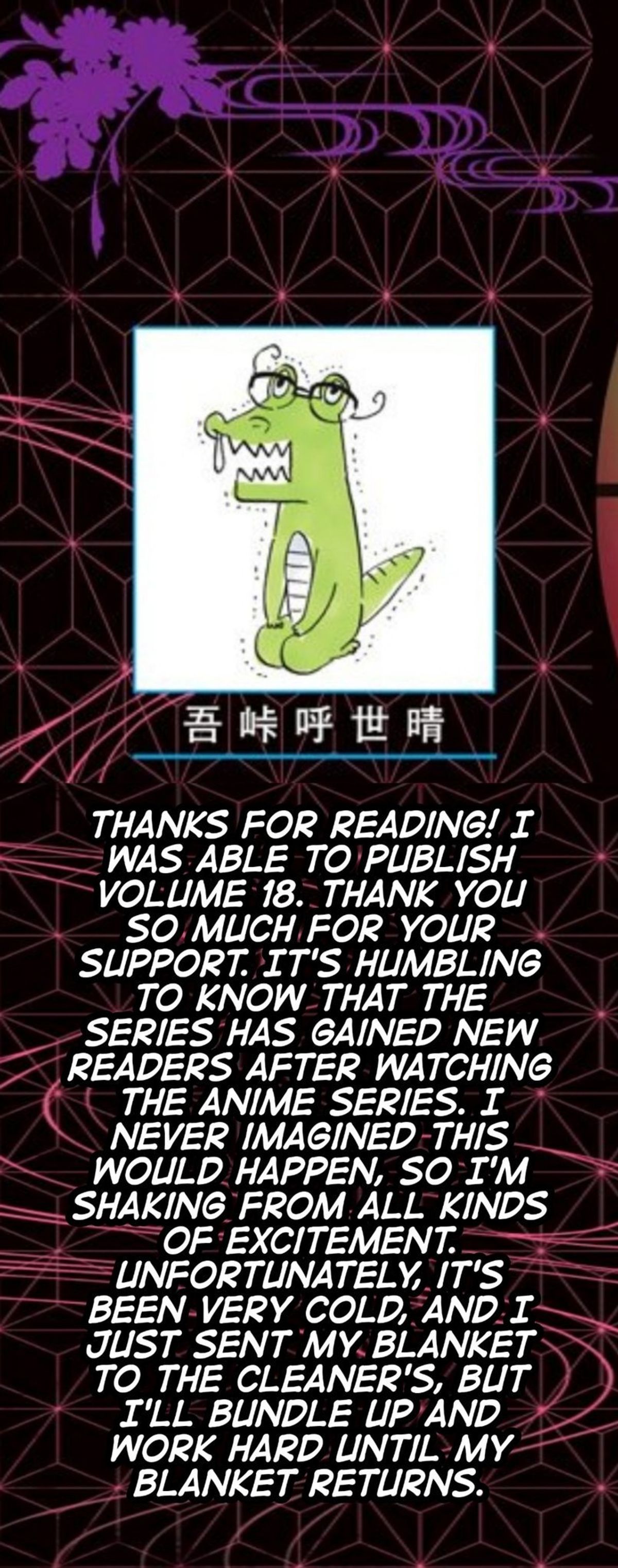 Gotouge - Grazie per aver letto il nuovo numero! Finalmente è stato pubblicato il volume 18. Vi ringrazio davvero per il vostro supporto. Mi mette in soggezione sapere che la serie ha ottenuto così tanti nuovi lettori che vengono dall’anime. Non avrei mai immaginato che potesse accadere una cosa simile, quindi sono in fibrillazione per tutta questa eccitazione. Sfortunatamente fa molto freddo e ho appena portato la mia coperta in lavanderia, ma mi coprirò e lavorerò duramente finché la mia coperta non farà ritorno!