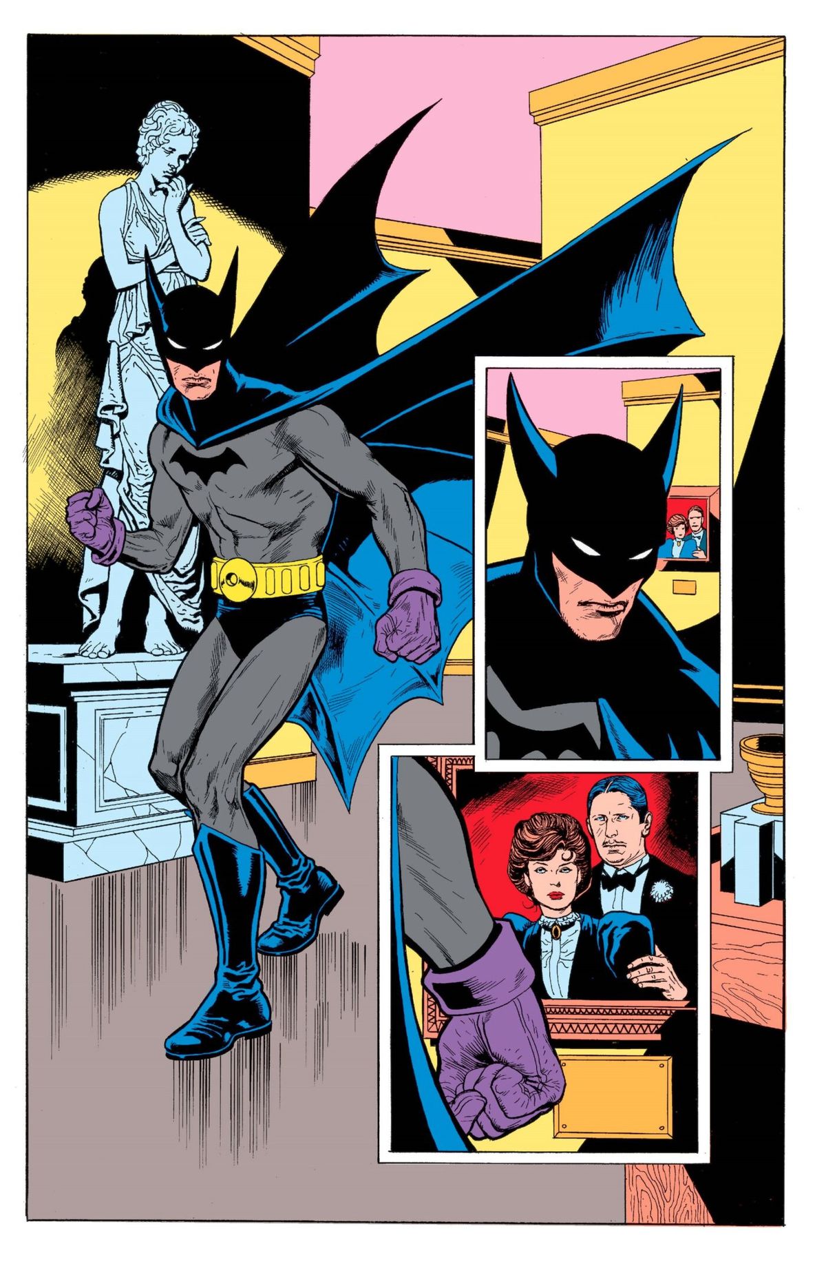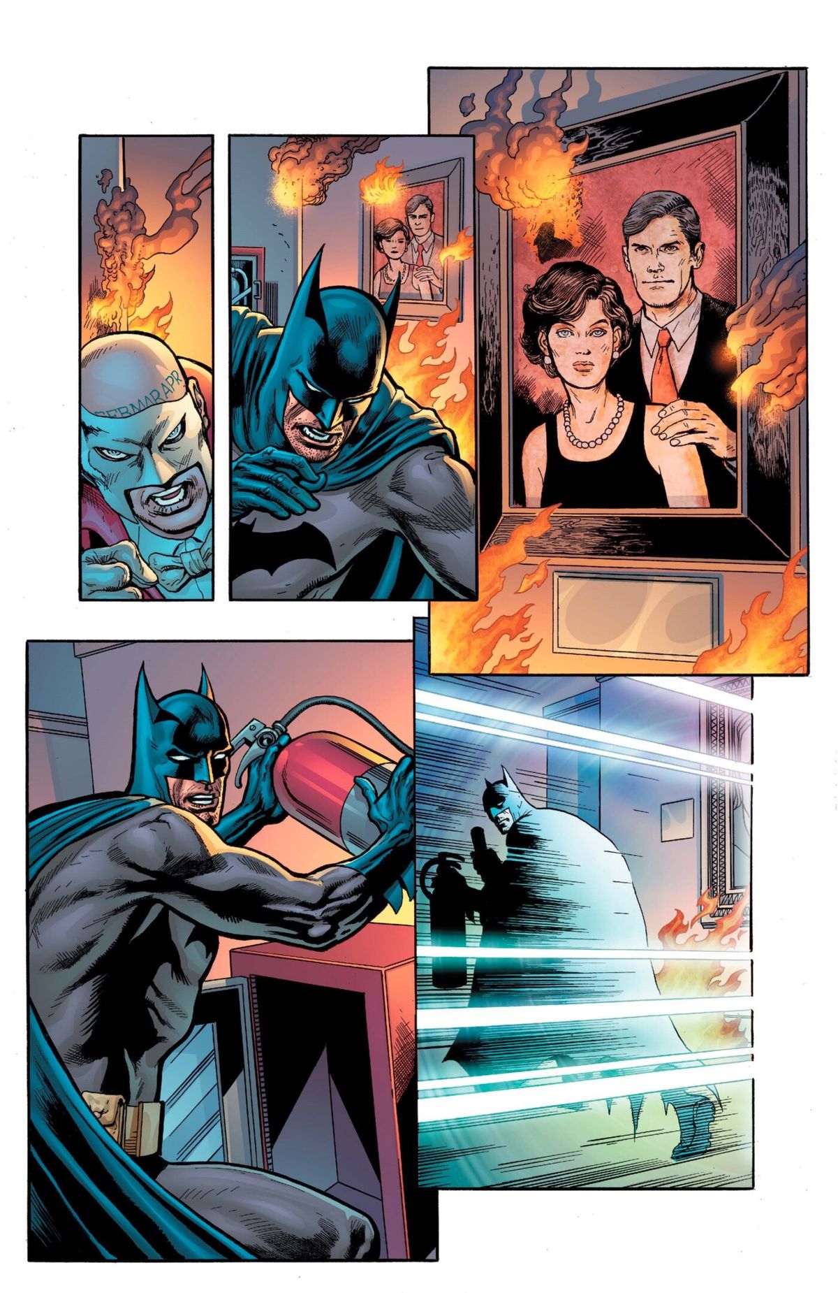 Tocca un'immagine per scorrere la galleriaNel racconto, vediamo Batman combattere contro dei suoi avversari che indossano delle maschere dalle fattezze di vampiro, mummia o Frankstein. Dopo aver impugnato un estintore per spegnere le fiamme che avvolgono il ritratto dei genitori, Bats viene accecato da un fascio di luce; quando riapre gli occhi, il Crociato Incappucciato si ritrova proiettato nel passato e indossa il suo costume originale, così come apparso per la prima volta nel 1939 ideato da Bob Kane e Bill Finger.