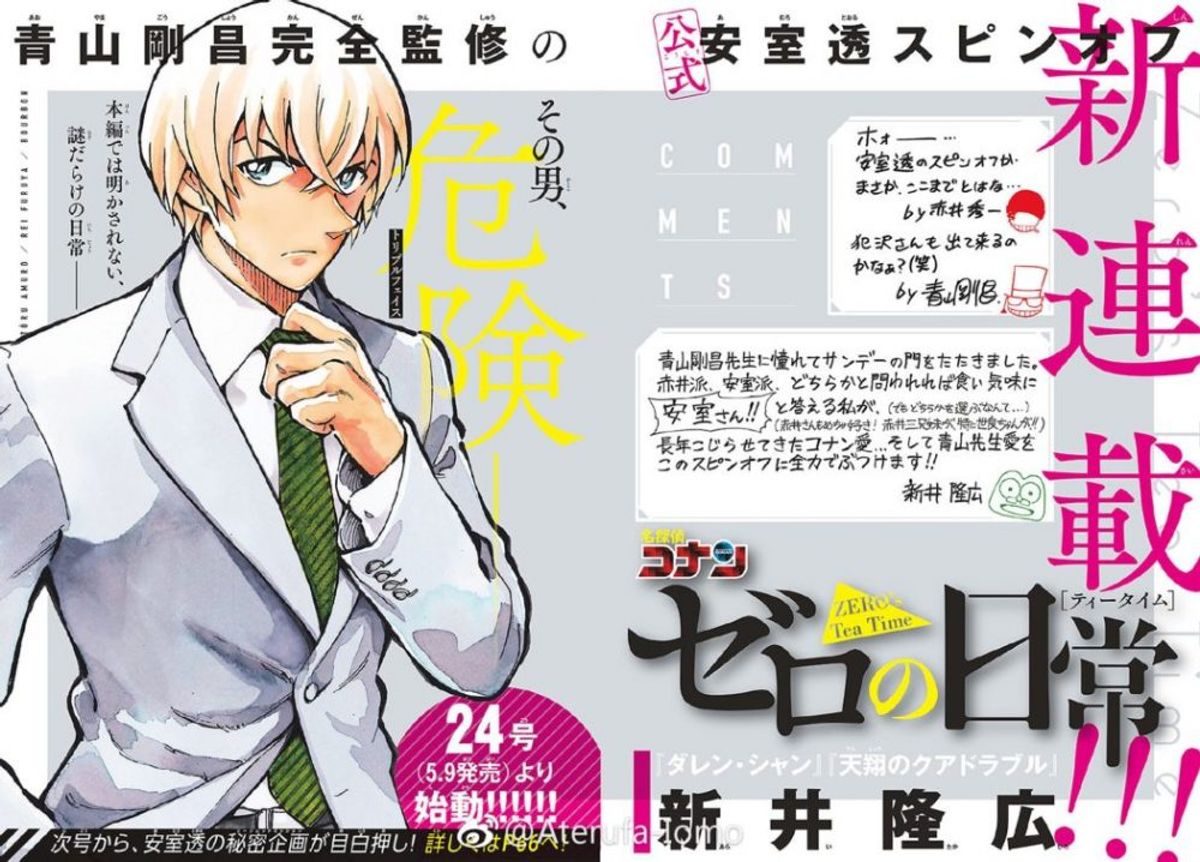 Dal prossimo 9 maggio, inoltre, farà il suo esordio su Weekly Shonen Sunday lo spin-off Zero no Tea Time, incentrato sul personaggio di Tooru "Zero" Amuro, alias Rei Furuya, agente di pubblica sicurezza giapponese.Il manga sarà realizzato da Takahiro Arai (I Miserabili) con la supervisione di Aoyama.