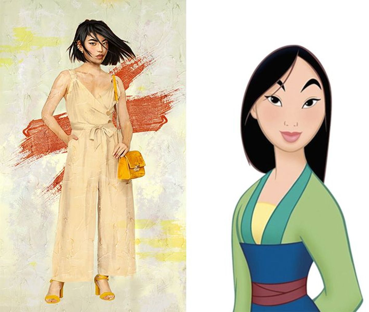 Tra i personaggi tirati in ballo per questo esperimento troviamo Mulan, Elsa (Frozen), Belle (La Bella e la bestia), Tiana (La Principessa e il ranocchio), Pocahontas e Ariel (La Sirenetta) ma anche Gaston (La Bella e la bestia) e John Smith (Pocahontas).Potete vedere alcune delle opere qua sotto: