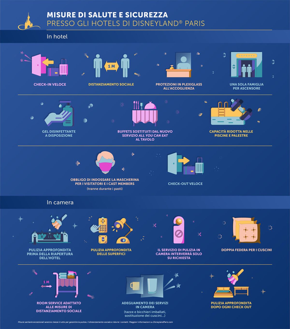La graduale riapertura è basata su un approccio incentrato sulla sicurezza, con misure sanitarie e di sicurezza rinforzate sia per i Cast Members che per gli ospiti. A partire da una limitazione degli ingressi giornalieri, che richiederà la prenotazione obbligatoria della visita per monitorare il flusso degli ospiti. Tutte le misure sono attuate per allinearci alle norme di distanziamento sociale richieste dal governo. Di conseguenza, alcune esperienze come la Parata Disney Stars on Parade e lo spettacolo serale Disney Illuminations, sono al momento rimandati e ritorneranno presto.