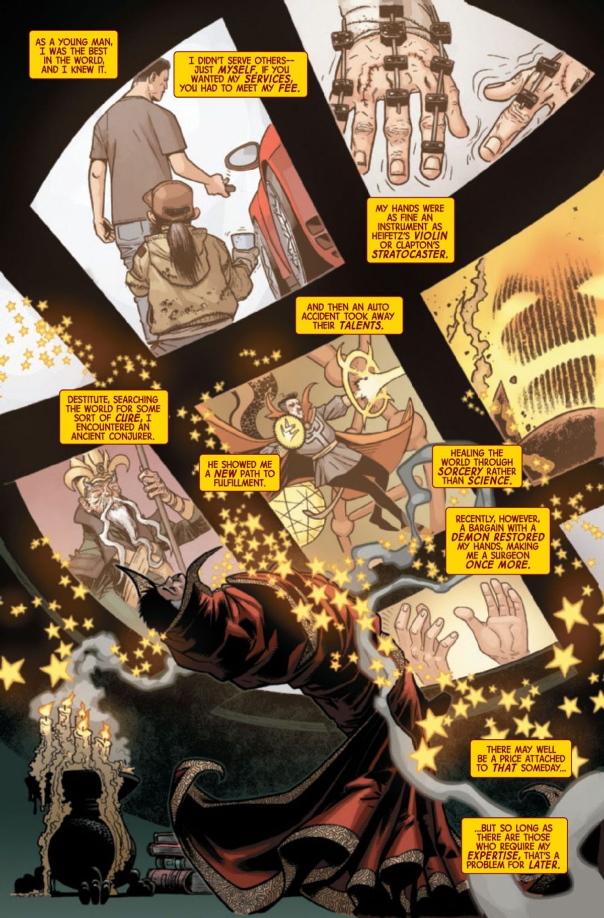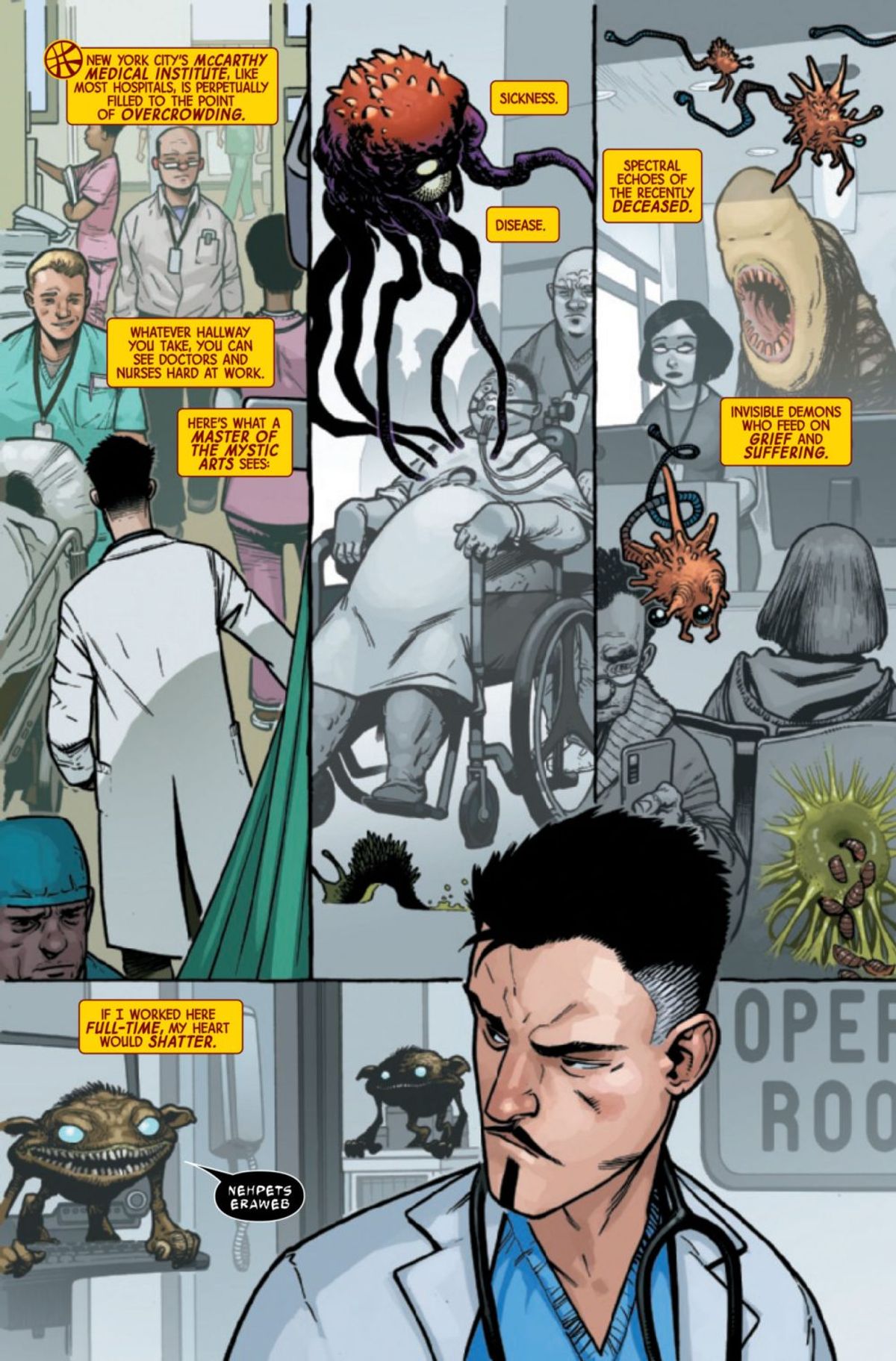 La Casa delle Idee ha diffuso un’anteprima dell’albo in cui è possibile ammirare il nuovo status quo del Signore delle Arti Mistiche: come già annunciato, Stephen ha riacquisito il totale controllo delle sue mani - martoriate dall'incidente al centro delle sue origini - ed è dunque tornare a essere l’incredibile neurochirurgo di una volta.La vita di Doctor Strange si divide ora tra due attività: di giorno al McCarthy Medical Institute (dove lavora anche Jane Foster, alias Valchiria), mettendo a disposizione le sue abilità per salvare vite umane, e la notte come estremo difensore della Terra da minacce mistiche di ogni sorta.