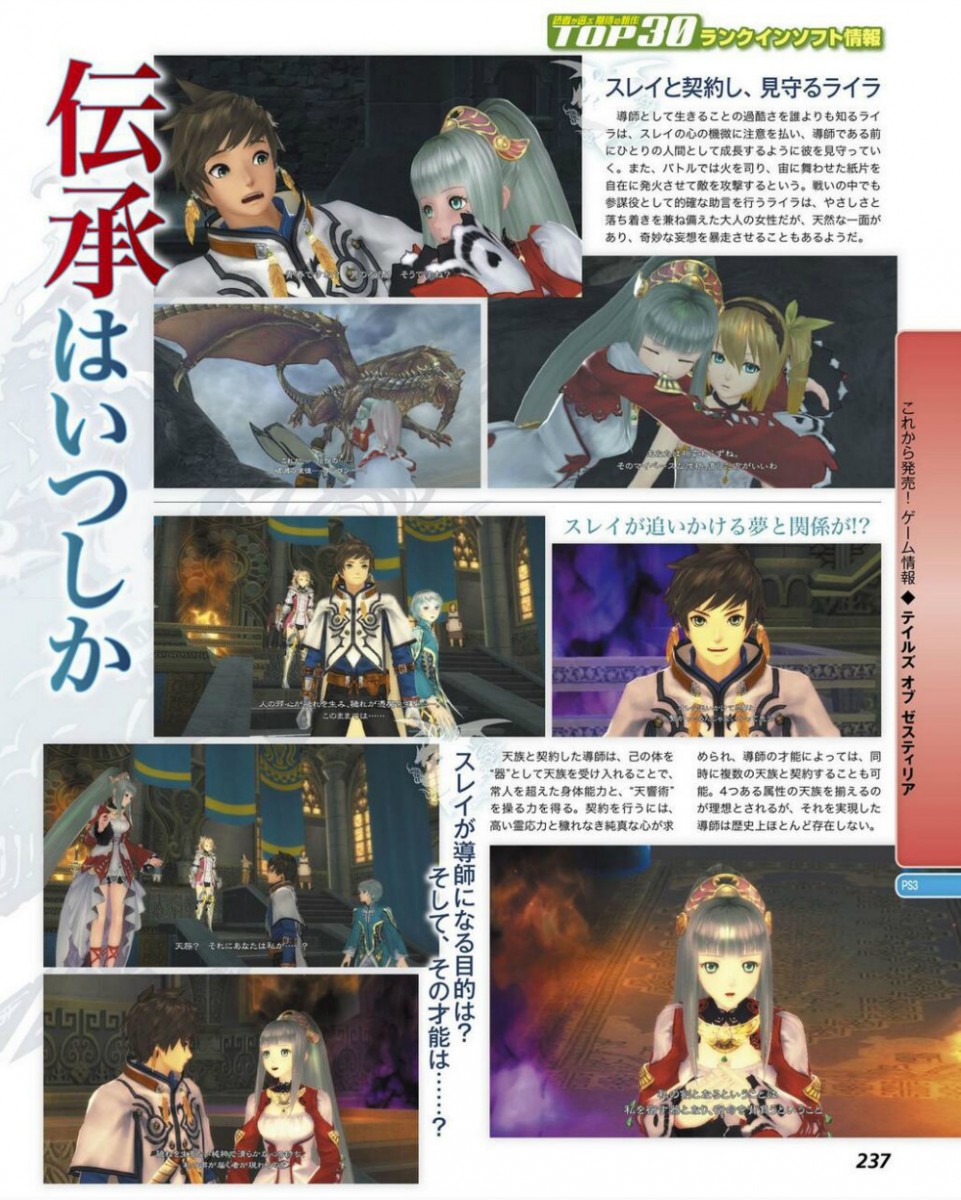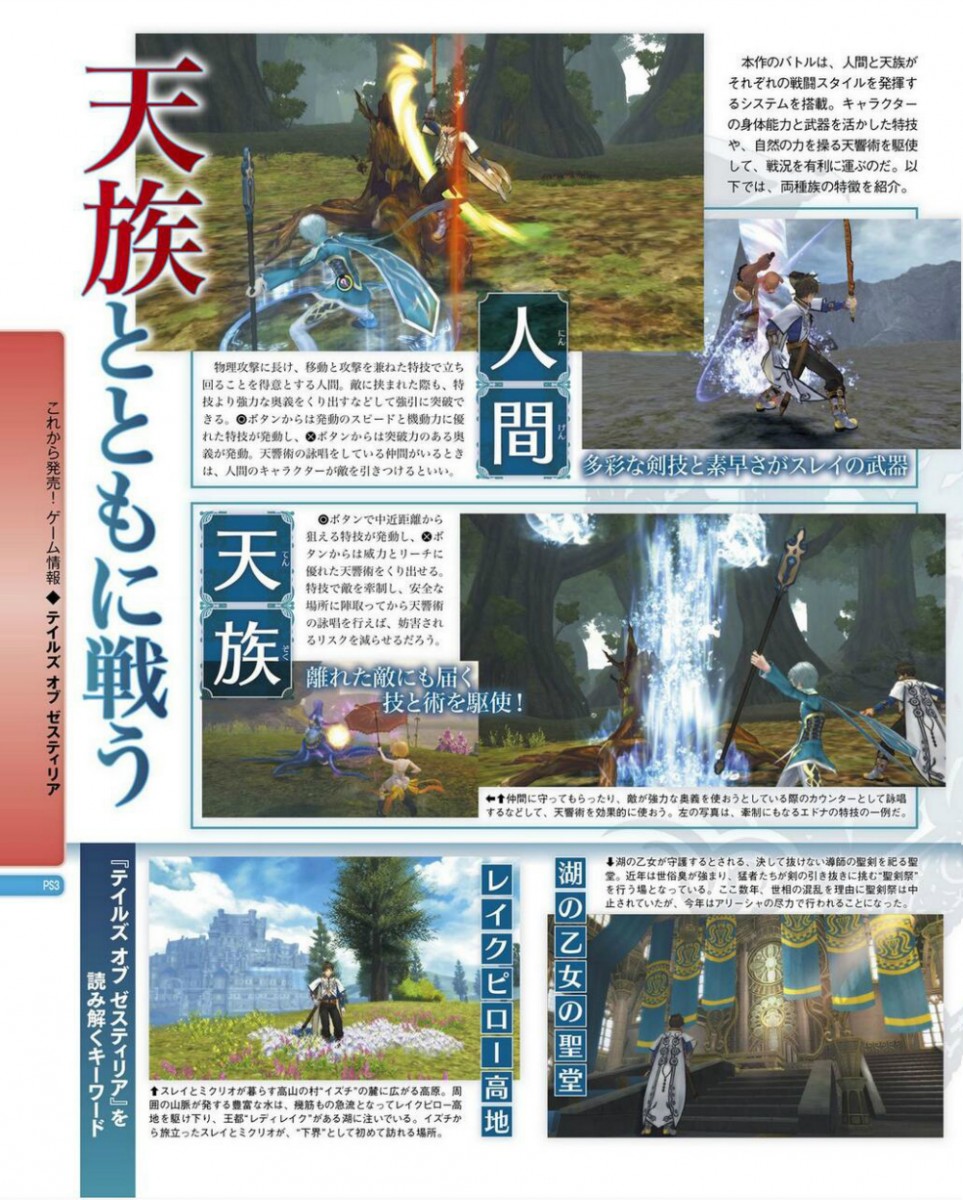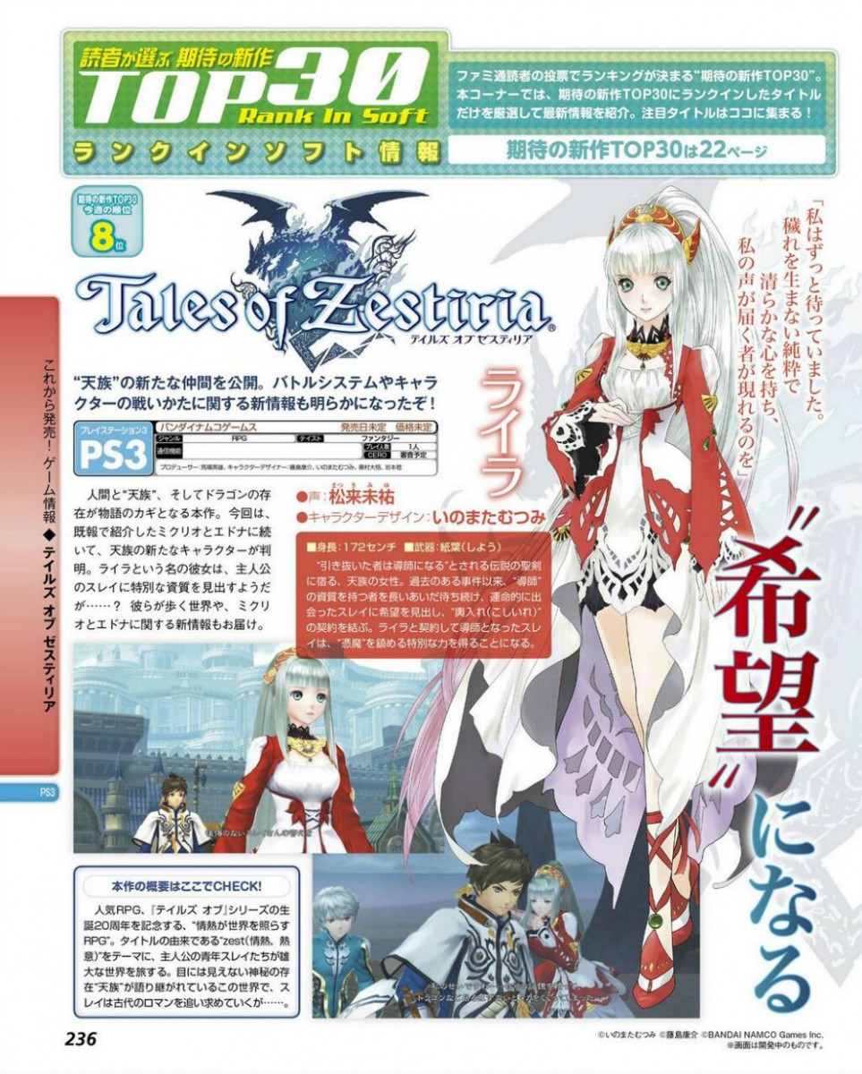 Nel suo ultimo numero, la rivista giapponese Famitsu ha dedicato un servizio a Tales of Zestiria, prossimo capitolo della serie di Bandai Namco, in arrivo in esclusiva su PlayStation 3. Sono state mostrate nuove immagini del gioco, insieme ad un nuovo personaggio: si tratta di Lailah, una ragazza che, per varie ragioni, s'impegna in un contratto matrimoniale con il protagonista, Slay. Eccovi le scansioni delle pagine della rivista.
