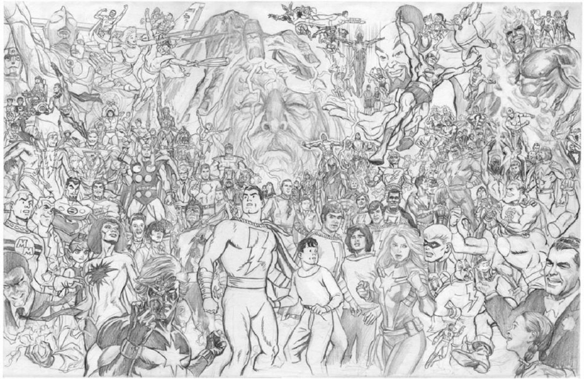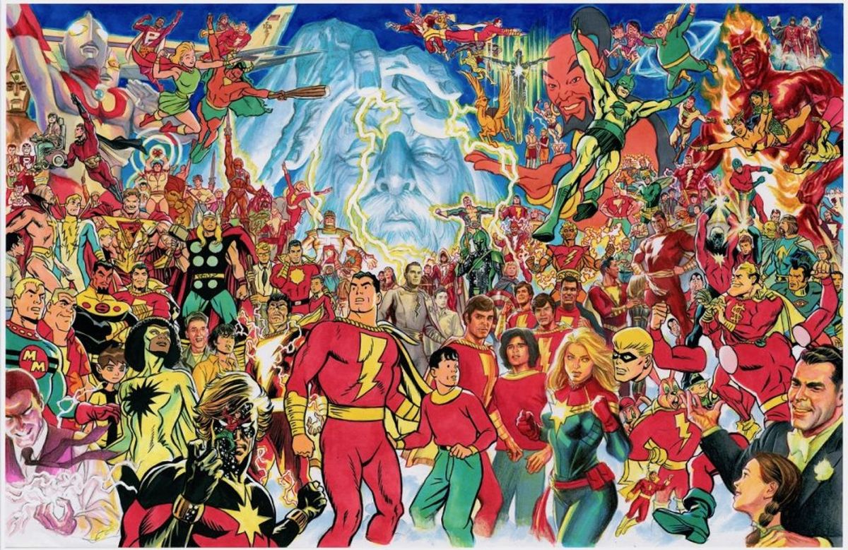 Divenuto il super eroe più popolare degli anni Quaranta, arrivando a vendere più di Superman, Shazam! ha in qualche modo influenzato non solo il futuro Mar-Vell della Casa delle Idee ma anche personaggi come Thor, He-Man, Miracleman (in precedenza Marvel Man) e il giapponese Ultraman, come sottolinea Ross nella sua rappresentazione, che va inoltre a ricatturare lo stile appartenente al creatore di ciascun personaggio.Ecco come ha presentato l'illustrazione l'artista di Marvels: