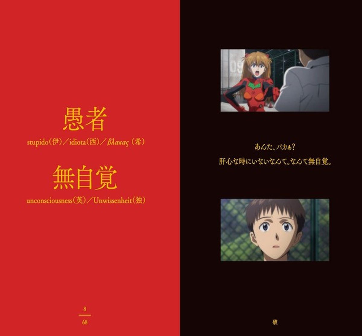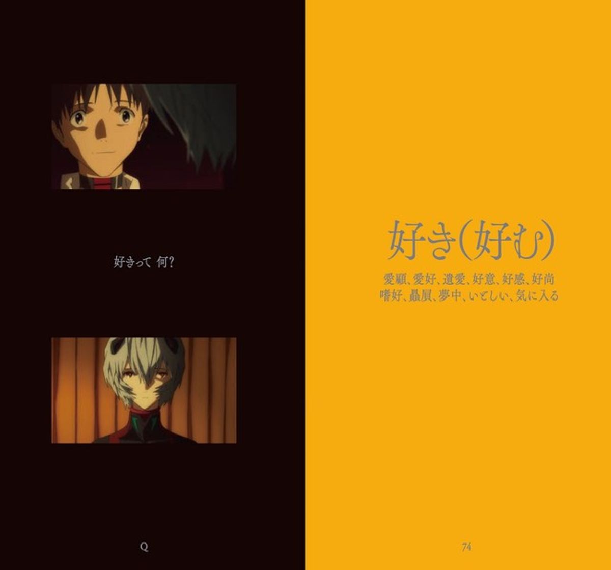 C'è decisamente più affinità tra l'egocentrica Asuka Soryu Langley, al comando dell'Eva-02, e il linguaggio creativo, con sinonimi disponibili in otto lingue.Mari Illustrious Makinami, personaggio introdotto nel film 2.0 You Can (Not) Advance (secondo capitolo della tetralogia Rebuild of Evangelion), è invece il testimonial del libro sulle parole collegate e la scelta dei vocaboli.