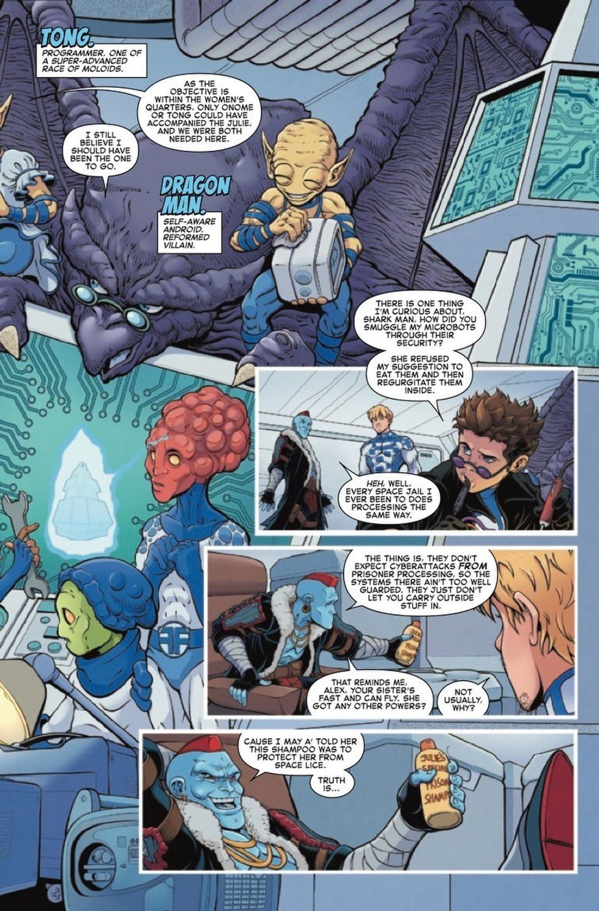 Robson - Si tratta della storia di un gruppo di grandi menti di una nuova generazione. Sono tutti intelligentissimi e tutti super. Quel che aggiungiamo al mix è il fatto di mostrarvi una nuova fase delle loro vite e il modo in cui operano come unità, dopo un periodo di maturazione. Jeremy ha messo assieme grandi idee in termini di personaggi e avventure, e io non vedo l'ora di affondare i denti nei numeri che verranno.Whitley - Nel periodo di assenza dei Fantastici Quattro dal pianeta, i ragazzi hanno collaborato con loro nel rimettere assieme il Multiverso, dopo Secret Wars. Ora che gli FQ sono tornati ai loro ruoli sulla Terra, volevamo scoprire cosa stesse facendo la Fondazione Futuro. La nostra editor, Sarah Brunstad, mi ha avvicinato per capire che idee avessi in merito, per riportare questo team di super eroi ragazzini sotto i riflettori, e abbiamo messo assieme quel che credo sia un ottimo piano di battaglia per raccontare storie con al centro questi giovanotti.