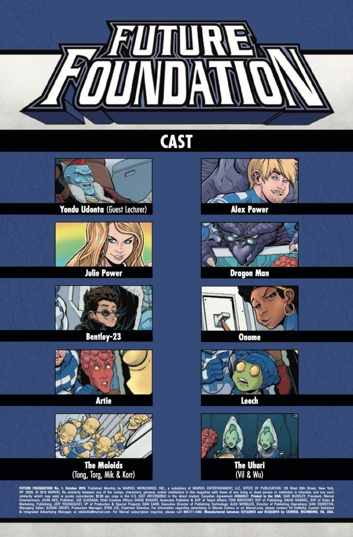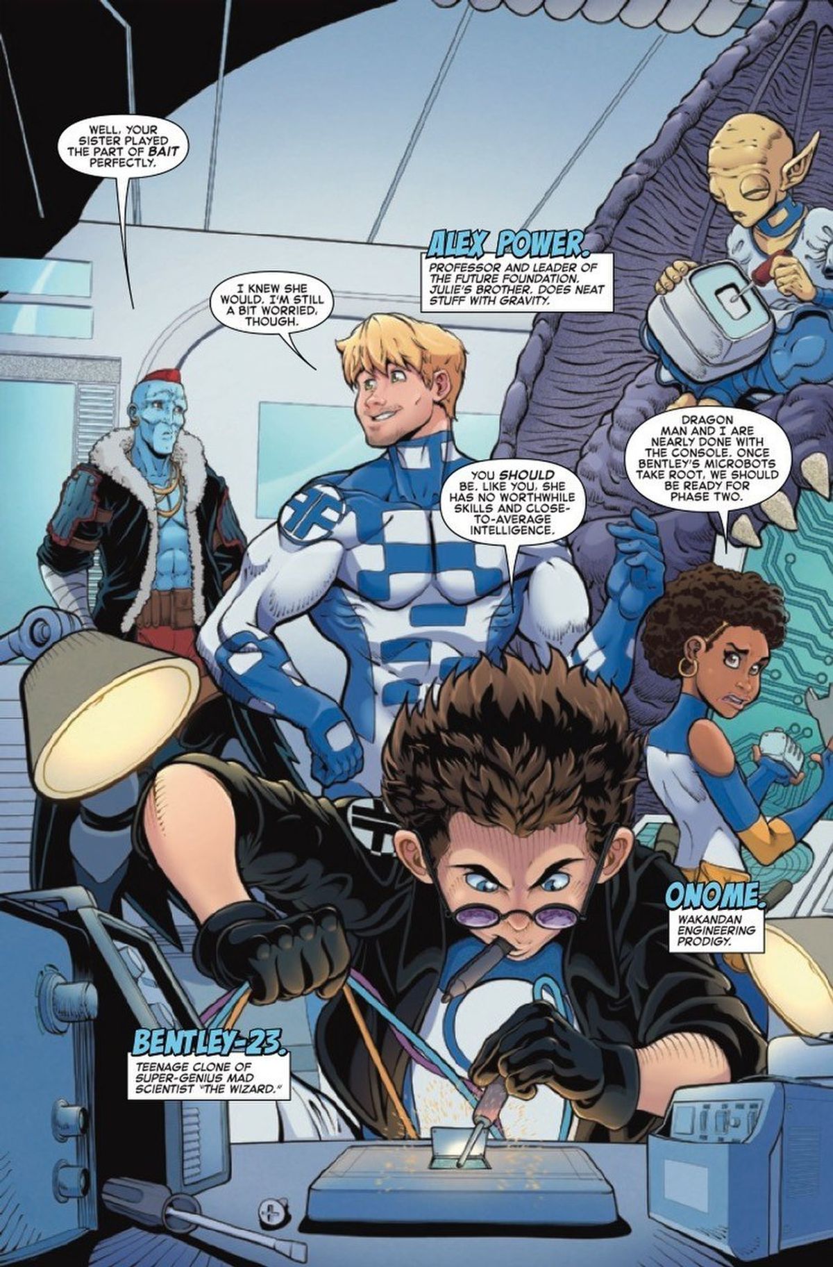 Alex e Julie Power, del Power Pack, saranno i co-leader della Fondazione Futuro, composta da Dragon Man, dall'ingegnere wakandiano Onome, dal clone bambino di Wizard di nome Bentley-23, dai talpoidi evoluti Korr, Mik, Tong e Turk, dai mutanti Artie e Pulce e dai principi Uhari Wu e Vil. Al gruppo si unirà un membro degli originali Guardiani della Galassia, Yondu.
