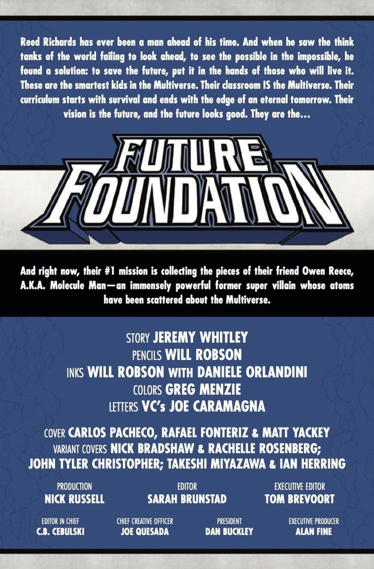 Whitley - La Fondazione Futuro è nata per essere il think thank di Reed Richards, un gruppo di geni della nuova generazione che lui pensa abbiano il potenziale per essere le nuove grandi menti dell'universo. Ma, con Reed e i Fantastici Quattro nuovamente sulla Terra, la Fondazione si trova ora nel multiverso, guidata da Alex Power. La missione è sia quella di continuare a imparare da esso sia trovare i brandelli dispersi del loro amico Molecola e un modo per rimetterlo assieme. Ovviamente non sono gli unici sulle sue tracce.