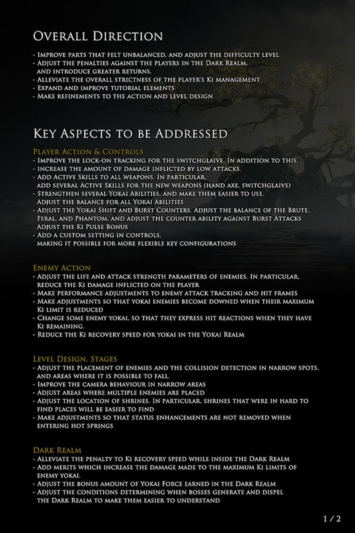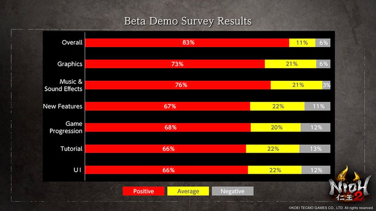 Infatti, alcune aree saranno rese meno difficili, mentre verrà curato maggiormente il bilanciamento degli Yokai e della gestione del Ki, con lo scopo di rendere il titolo più fruibile (ma comunque punitivo) per tutto il pubblico di appassionati. Appassionati che potranno trovare anche un tutorial più chiaro, un level design rifinito e numerosi aggiustamenti alla creazione del personaggio all'UI, al comparto sonoro e alle funzionalità online.Insomma: gli sviluppatori di NiOh 2 sembrano avere davvero a cuore la propria utenza, vista la cura maniacale riposta nel correggere i propri errori. Se volete scoprire nel dettaglio quali saranno i cambiamenti dalla Open Beta alla versione finale in arrivo a marzo, non dovete far altro che guardare la galleria qui sotto, contenente tre immagini dedicate ai risultati del sondaggio tra i dev e i beta tester.