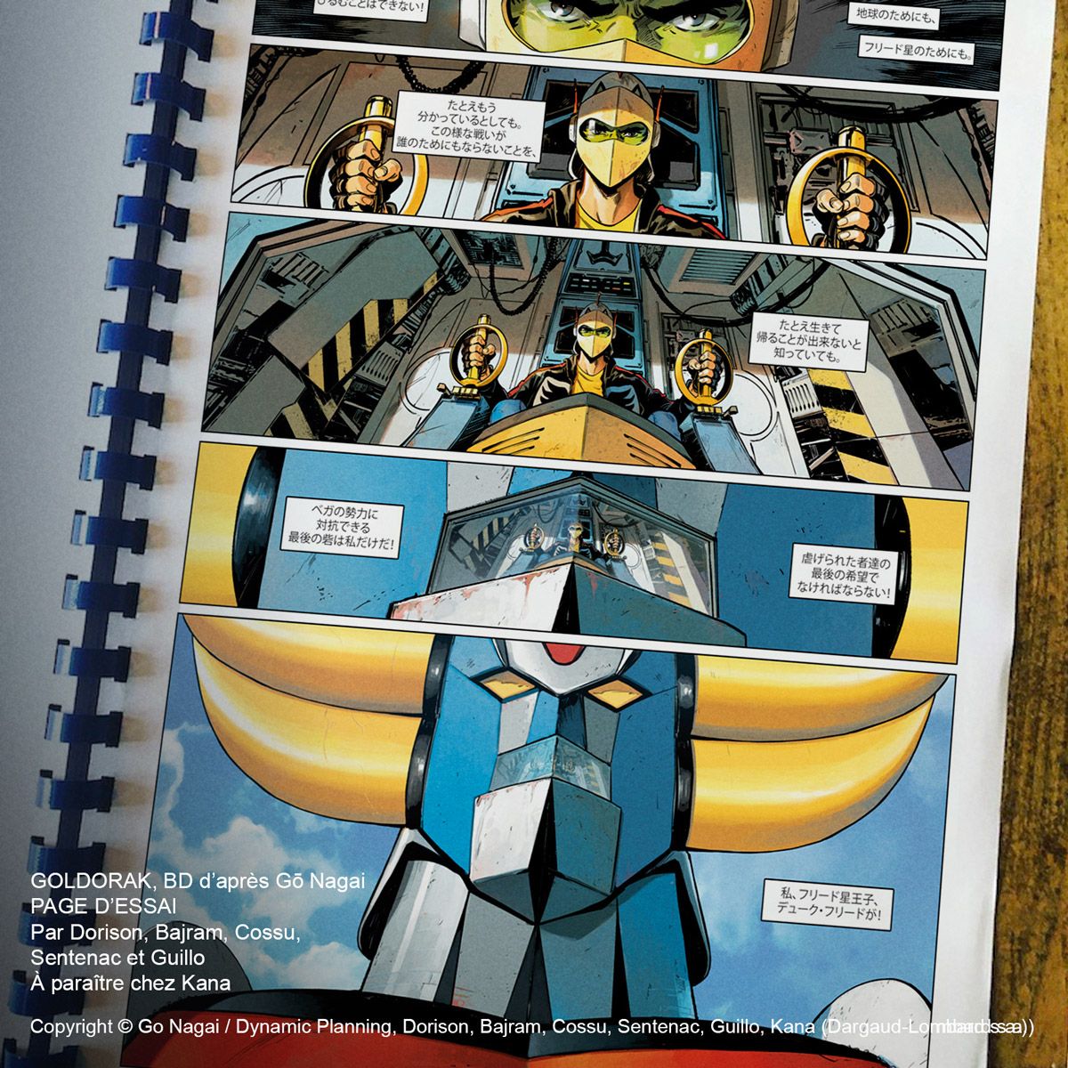 Lo scorso febbraio, al Festival Internazionale del Fumetto di Angouleme la casa editrice Kana aveva annunciato un nuovo volume realizzato da autori francesi che proseguirà le vicende dopo la conclusione di UFO Robot Goldrake. Il fumetto di 120 pagine si intitolerà Goldorak e sarà pubblicato il prossimo ottobre, con una storia inedita scritta da Xavier Dorison (Human Stock Exchange) e Denis Bajram (Universal War One), disegnata da Brice Cossu (FRNCK) e Alexis Sentenac (Siberia 56), con i colori di Yoann Guillo (Louca).