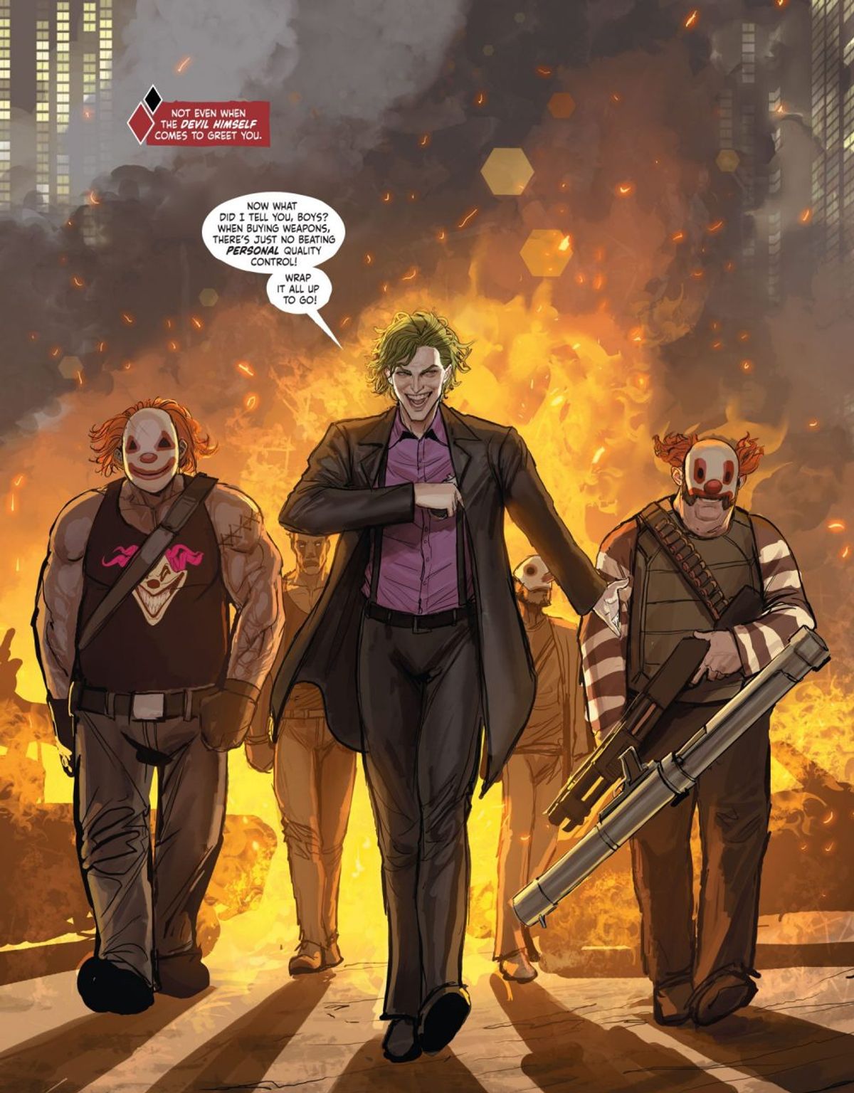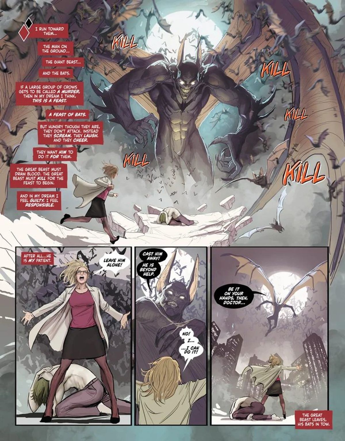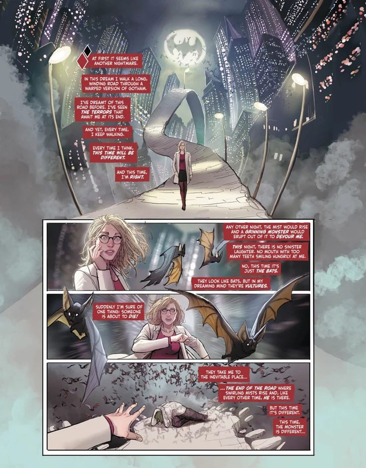 Per lei, Batman è un mostro, spaventoso quanto il Joker. Uno degli aspetti delle storie di Batman è che siamo abituati a vedere il mondo con i suoi occhi, molto meno a guardarlo dal punto di vista di chi non vuole assolutamente avere a che fare con lui, che non lo vuole nella propria vita, di chi alla fine viene preso a calci e va a casa con le ossa rotte. Per qualcuno che ha paura di lui, questa idea di vederlo come un mostro è qualcosa che rimane incollato alla mente. Sicuramente succede ad Harley Quinn.