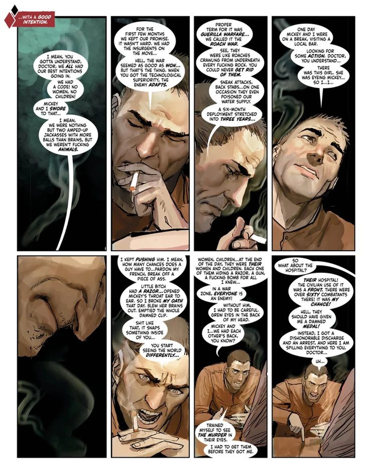 La storia è quasi un body horror che vede una protagonista perfettamente in grado di capire che quel che sta facendo è sbagliato, irrevocabilmente malvagio, ma continua a fabbricarsi giustificazioni, perché per natura vive in stato di dipendenza. Non fraintendete: la relazione tra Harley Quinn e Joker è un fatto di dipendenza reciproca e assuefazione. In lei c'è lucidità mentale. Harley capisce quel che fa, rimane sempre una psichiatra per mentalità, ma c'è qualcun altro al timone, ormai. E lei lo sa. Si tratta di una natura terrificante, che ti spinge a fare cose orribili nella vita. Sai cos'è, ma continui a trovare nuovi modi, nuove strade per giustificarla a te stessa. Il che è spaventoso e potente.
