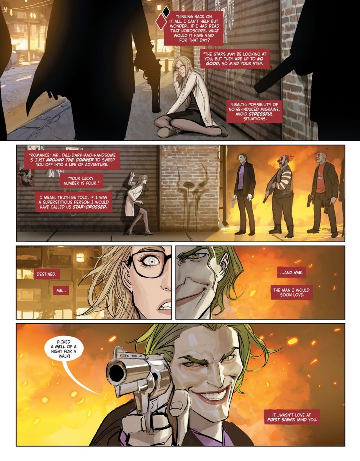 Harleen ha preso le mosse, un po' come tutti i miei fumetti, come una storia di esplorazione dei personaggi. Mi piace realizzare queste strip brevi e queste immagini in cui cerco di riassumere l'identità centrale di un personaggio, quello che secondo me è il suo nucleo. Le due principali colonne di ogni storia sono la narrazione e i protagonisti. Come dicevo, Harleen è nato come esplorazione, che poi con il tempo ha preso la forma di una vicenda vera e propria. Una volta che ho capito quale storia volessi raccontare su Harley, ho deciso di scrivere un soggetto. Ho contattato il mio editor, Andy Khouri, e gli ho chiesto a chi avrei dovuto proporlo. Mi disse di mandarglielo, rimase impressionato e si disse interessato. Da lì è cominciato tutto.